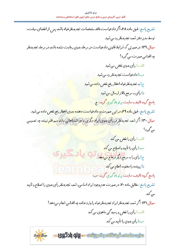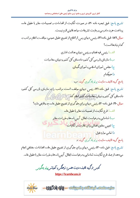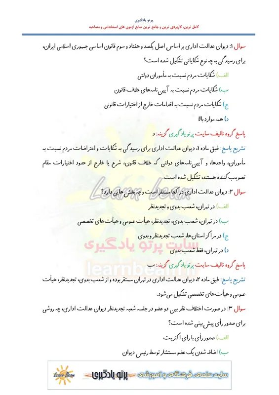 تست قانون دیوان عدالت اداری سوالات تستی قانون دیوان عدالت اداری شامل 190 تست در 76 صفحه با پاسخ تشریحی در قالب فایل pdf می باشد. مجموعه سوالات تستی قانون دیوان عدالت اداری قابل چاپ با کیفیت عالی جهت انسجام ذهنی، خودآزمایی و مطالعه سریع داوطلبین شرکت کننده در آزمون های استخدامی و در دوازدهمین امتحان مشترک فراگیر دستگاه های اجرایی کشور در سال 1403 مطابق با دفترچه راهنمای ثبت نام آزمون و اصلاحیه نهایی می باشد.