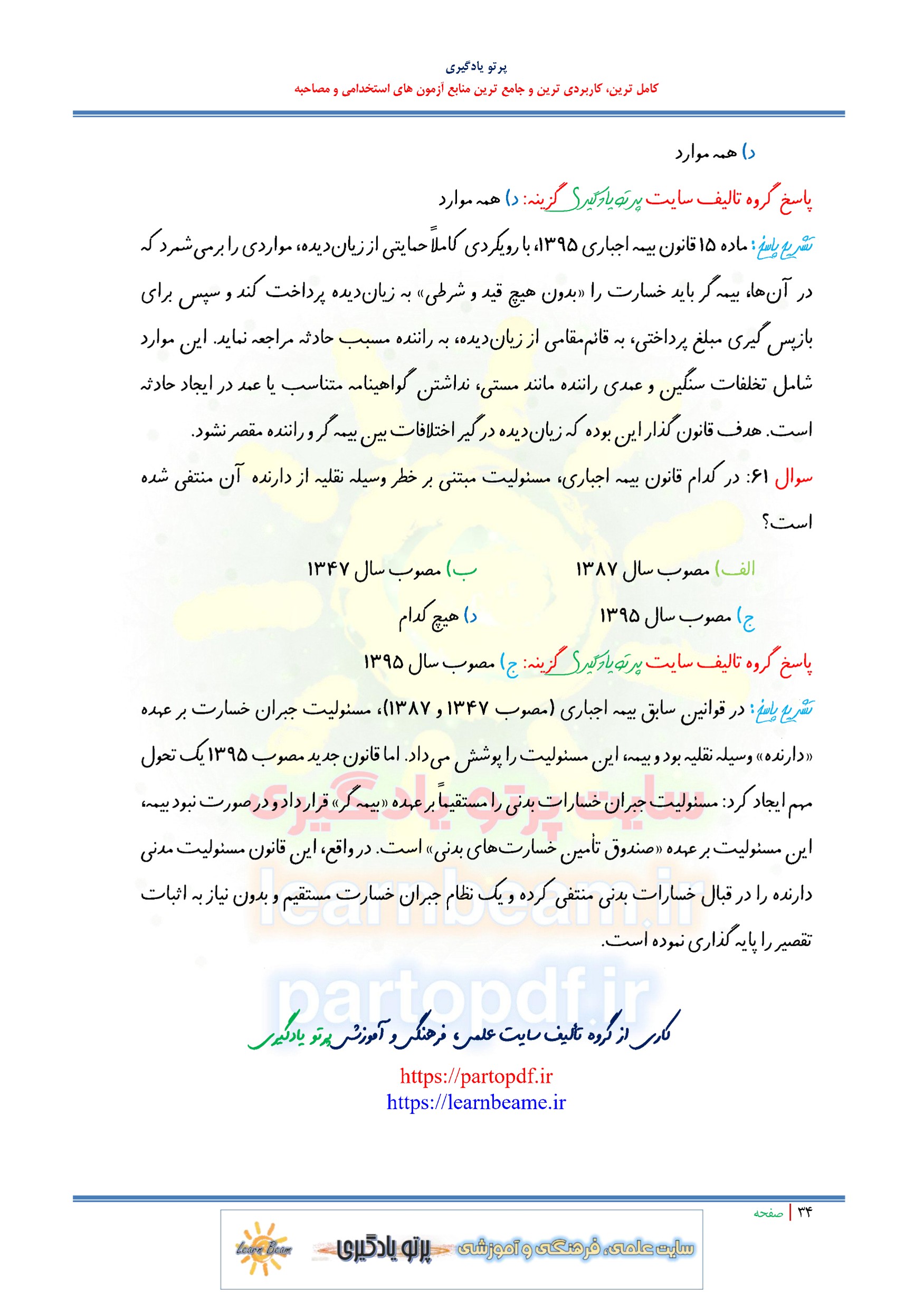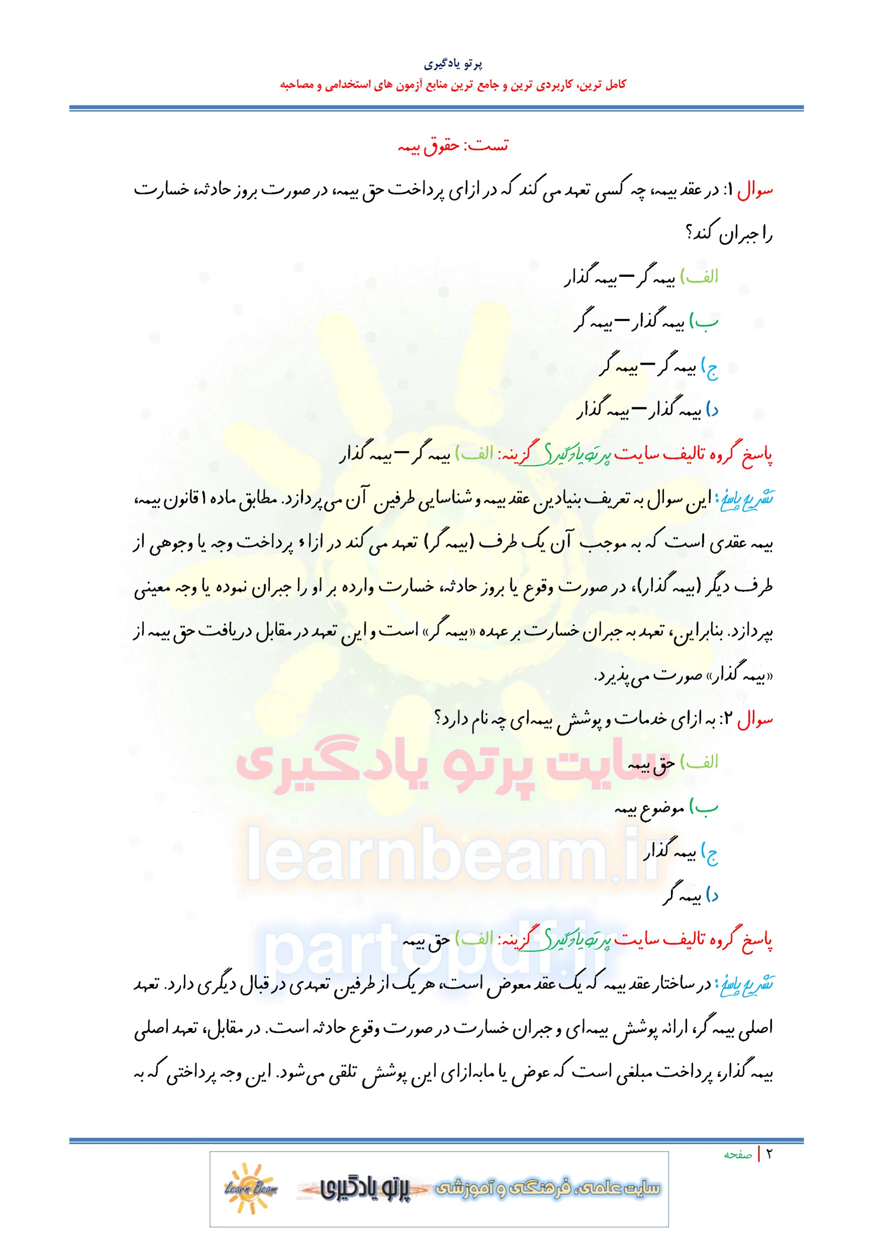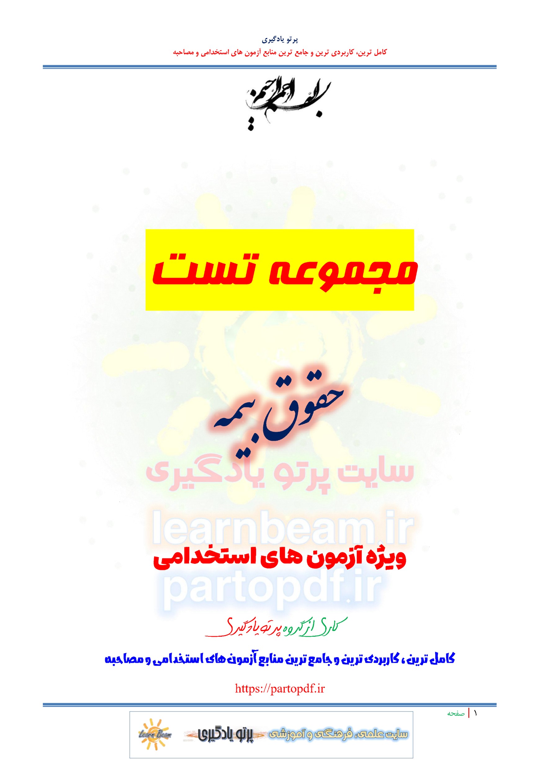 سوالات و تست حقوق بیمه. سوالات تستی حقوق بیمه ویژه استخدامی شرکت های بیمه جزوه سوالات تستی حقوق بیمه شامل 61 سوال با پاسخ تشریحی در 34 صفحه در قالب فایل pdf می باشد. مجموعه سوالات تستی حقوق بیمه قابل چاپ با کیفیت عالی جهت انسجام ذهنی، خودآزمایی و مطالعه سریع داوطلبین شرکت کننده در آزمون های استخدامی بیمه ها مطابق با دفترچه راهنمای ثبت نام آزمون و اصلاحیه نهایی می باشد. اگر به دنبال راهی سریع و مؤثر برای درک مفاهیم مهم حقوق بیمه هستید، جزوه سوالات تستی حقوق بیمه منبعی بینظیر برای داوطلبین و حرفهایها است که میخواهند با صرف کمترین زمان، بیشترین بهرهوری را داشته باشند. با این جزوه، نکات کلیدی را به سرعت بیاموزید و در آزمونها و پروژهها بدرخشید.