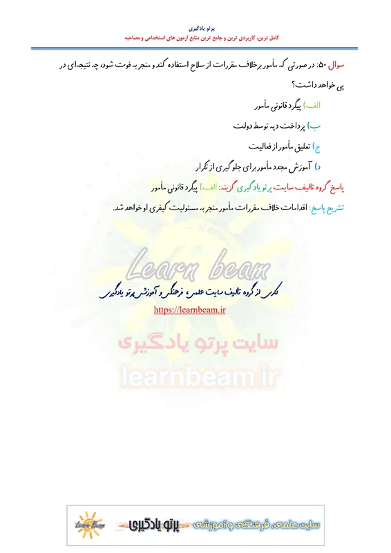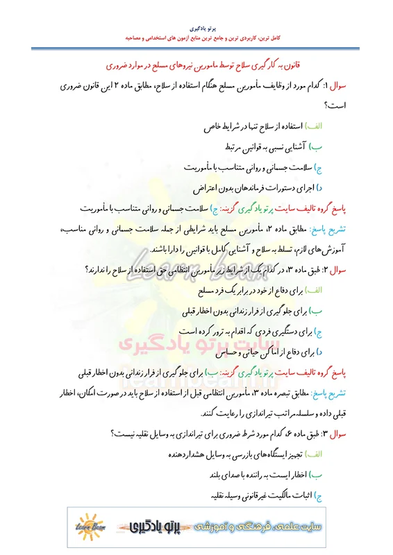تست قانون به کارگیری سلاح توسط مامورین نیروهای مسلح در موارد ضروری با پاسخ تشریحی شامل 50 تست در 20 صفحه در قالب pdf. مجموعه ای کامل برای مطالعه و موفقیت در آزمون استخدامی سازمان زندان ها است. مجموعه سوالات تستی قانون به کارگیری سلاح توسط مامورین نیروهای مسلح در موارد ضروری ارزشمند در قالب فایل پی دی اف می تواند مناسب ترین انتخاب برای انسجام ذهنی و آمادگی برای آزمون داوطلبین باشد. مجموعه سوالات تستی قانون به کارگیری سلاح توسط مامورین نیروهای مسلح در موارد ضروری برای تجمیع، جمع بندی و مرور سریع متناسب با سرفصل های اعلامی آزمون استخدامی زندان ها طراحی و تدوین شده است.