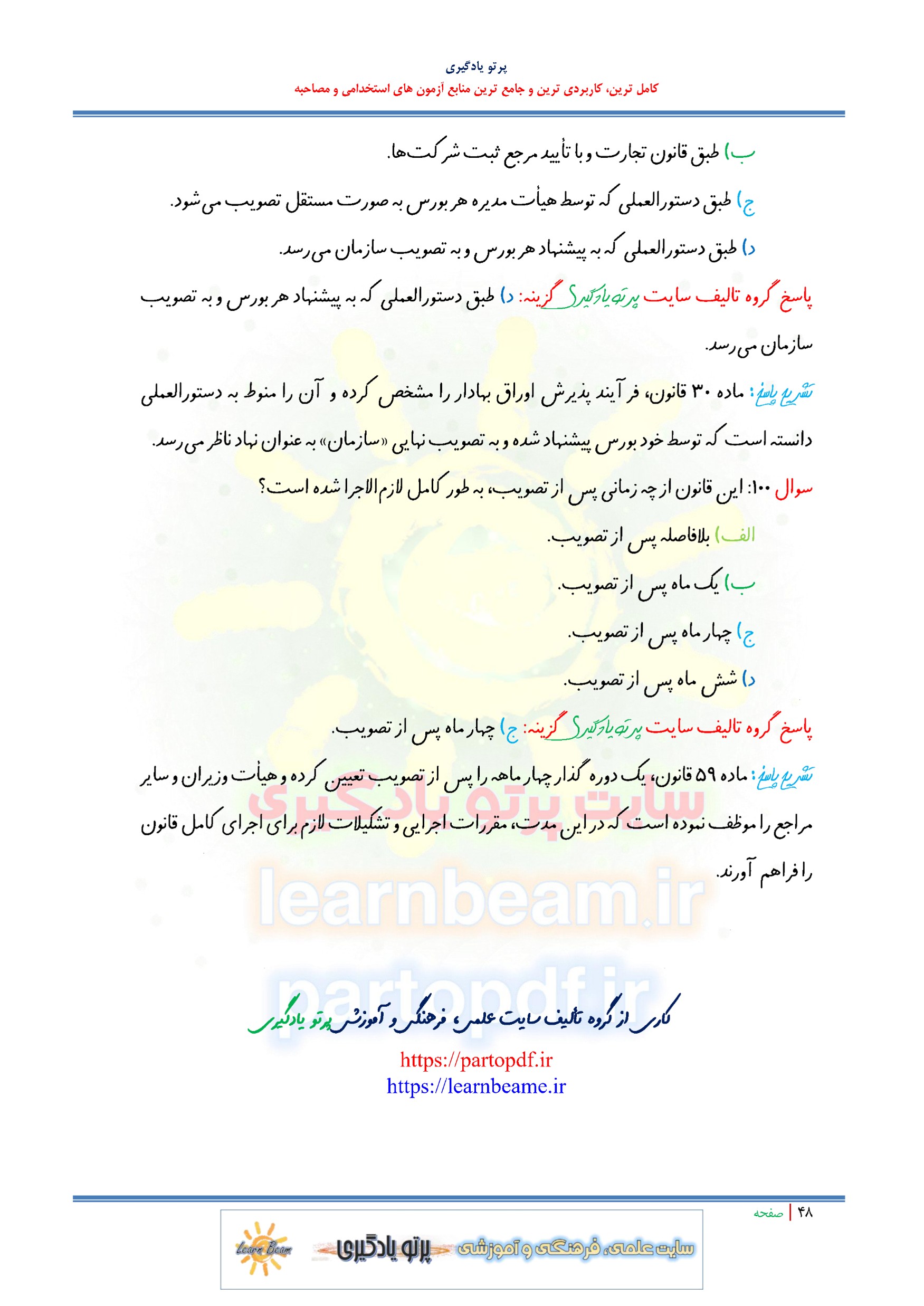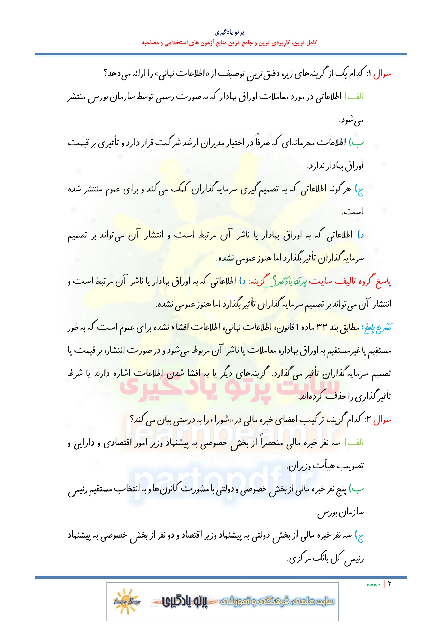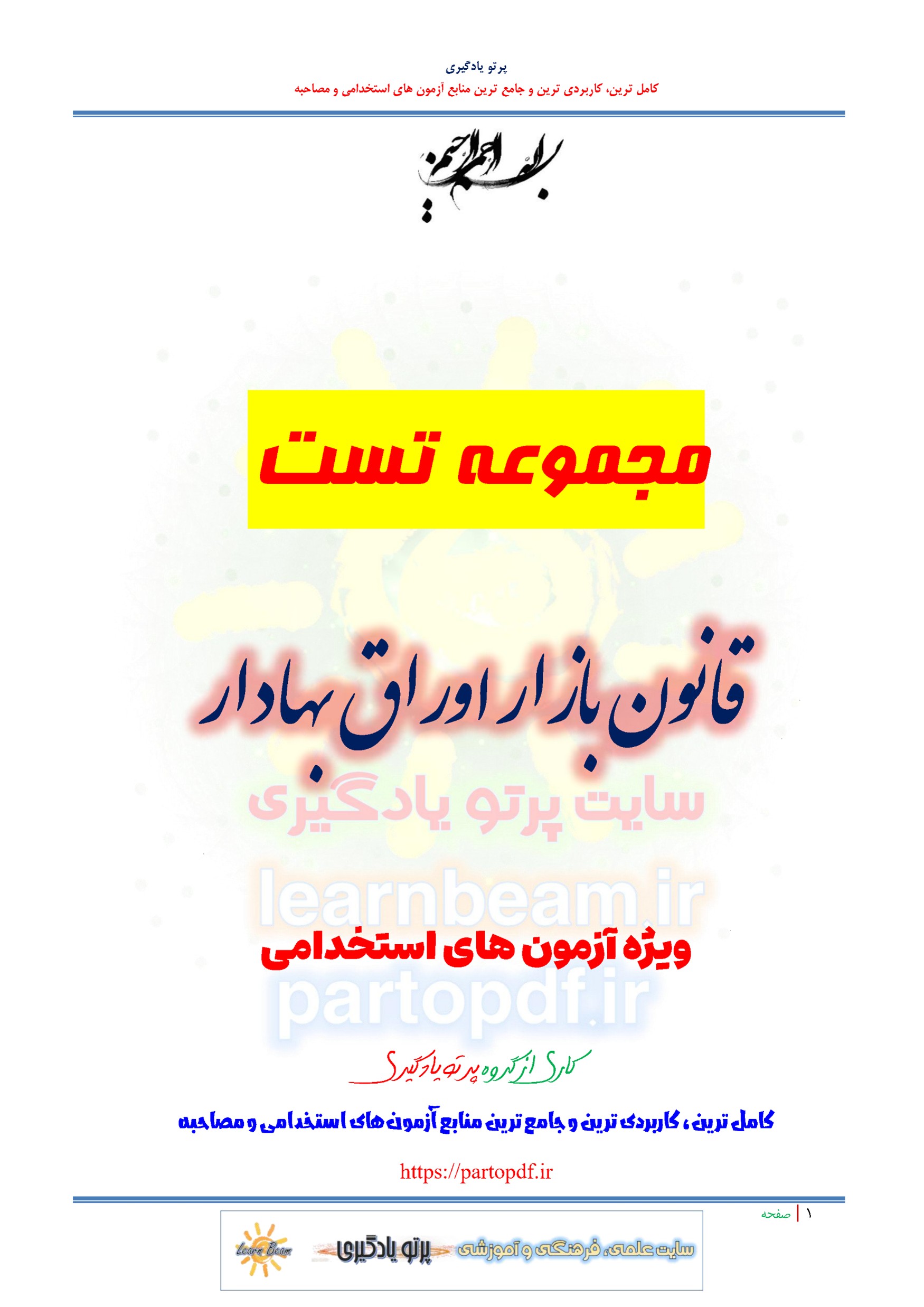 سوالات و تست قانون بازار اوراق بهادار سوالات قانون بازار اوراق بهادار شامل 100 سوال تستی در 48 صفحه با پاسخ تشریحی در قالب فایل pdf. بهترین منبع برای آزمون های استخدامی می باشد. مجموعه سوالات تستی قانون بازار اوراق بهادار مطالب خوانده شده داوطلبین آزمون استخدامی را نظم بخشیده و منسجم می سازد. این مجموعه مرور سریع داوطلب را سبب می شود و آگاهی های وی را نظم بخشیده و یک آمادگی و شبیه سازی را برای جلسه آزمون به همراه دارد. مطالعه این منبع برای همه داوطلبین شرکت کننده در آزمون های استخدامی پیشنهاد می شود.