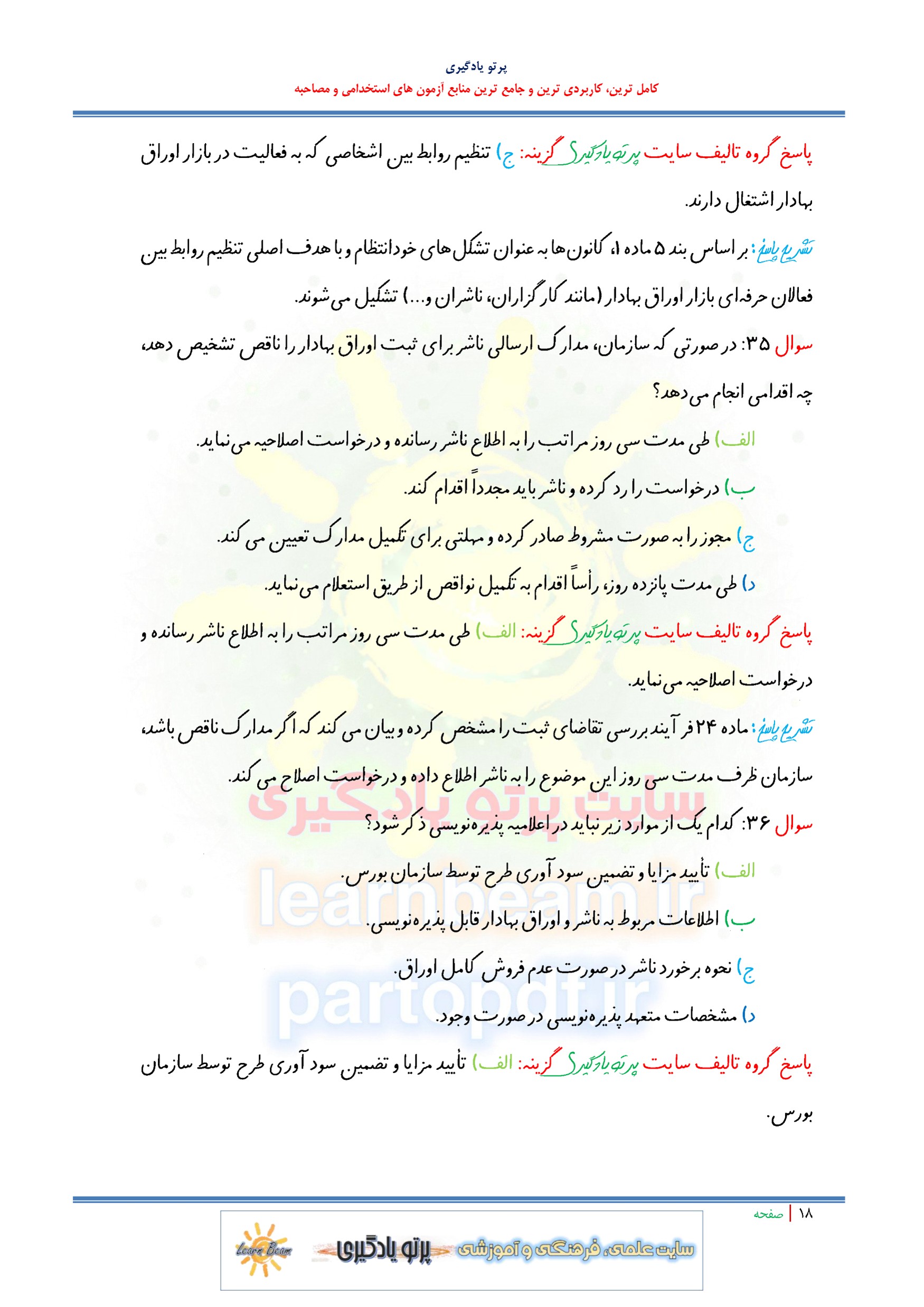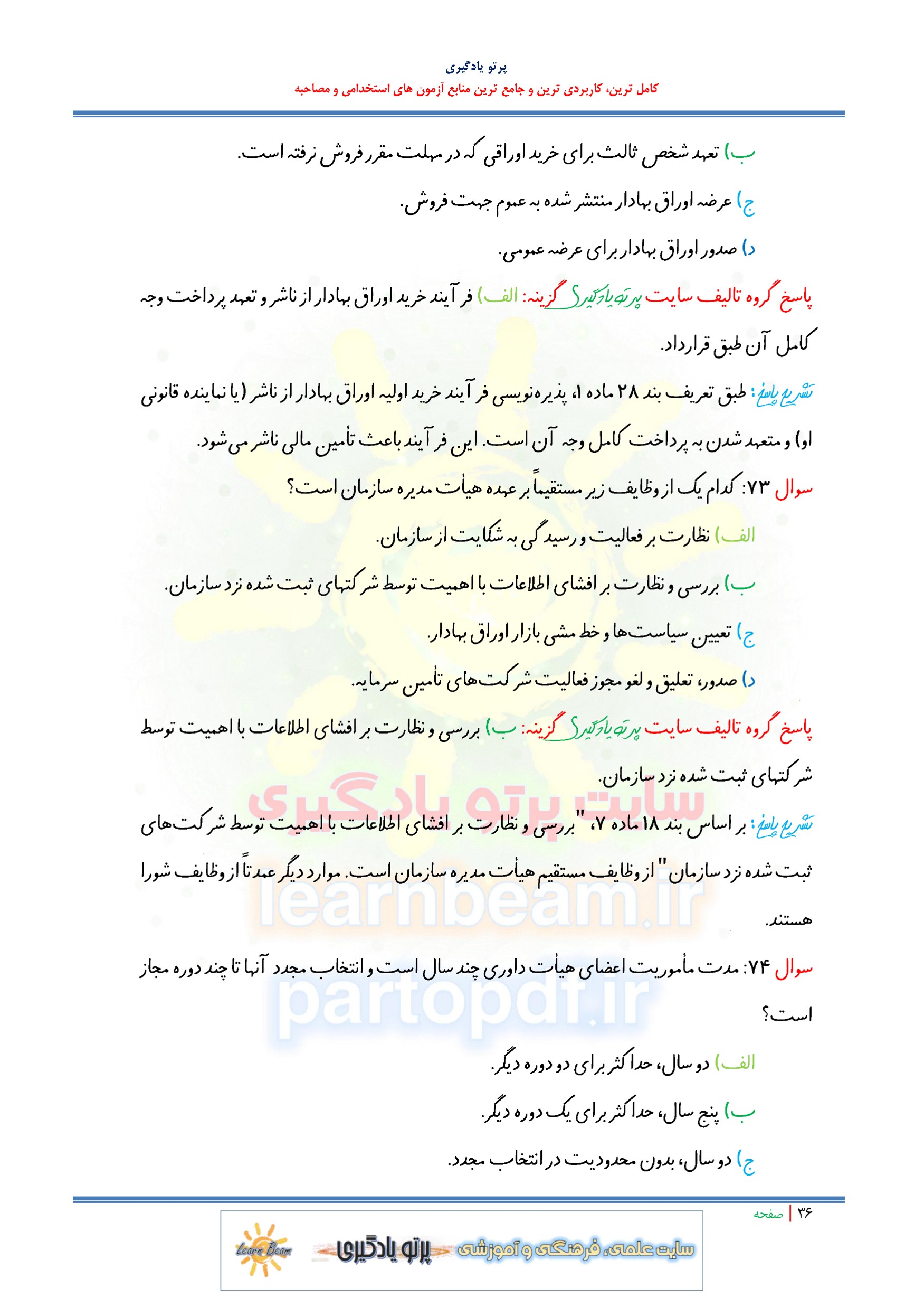 سوالات و تست قانون بازار اوراق بهادار سوالات تستی قانون بازار اوراق بهادار شامل 100 سوال تستی در 48 صفحه با پاسخ تشریحی در قالب فایل pdf. مطابق با سرفصل های دفترچه آزمون های استخدامی مجموعه سوالات تستی قانون بازار اوراق بهادار بهترین منبع برای آمادگی آزمون های استخدامی می باشد. مجموعه سوالات و تست قانون بازار اوراق بهادار مطالب خوانده شده داوطلبین آزمون استخدامی را نظم بخشیده و منسجم می سازد. مجموعه سوالات تستی قانون بازار اوراق بهادار ویژه آزمون های استخدامی مرور سریع داوطلب را سبب می شود و آگاهی های وی را نظم بخشیده و یک آمادگی و شبیه سازی را برای جلسه آزمون به همراه دارد. مطالعه پک مجموعه سوالات و تست قانون بازار اوراق بهادار برای داوطلبین آزمون های استخدامی پیشنهاد می شود.