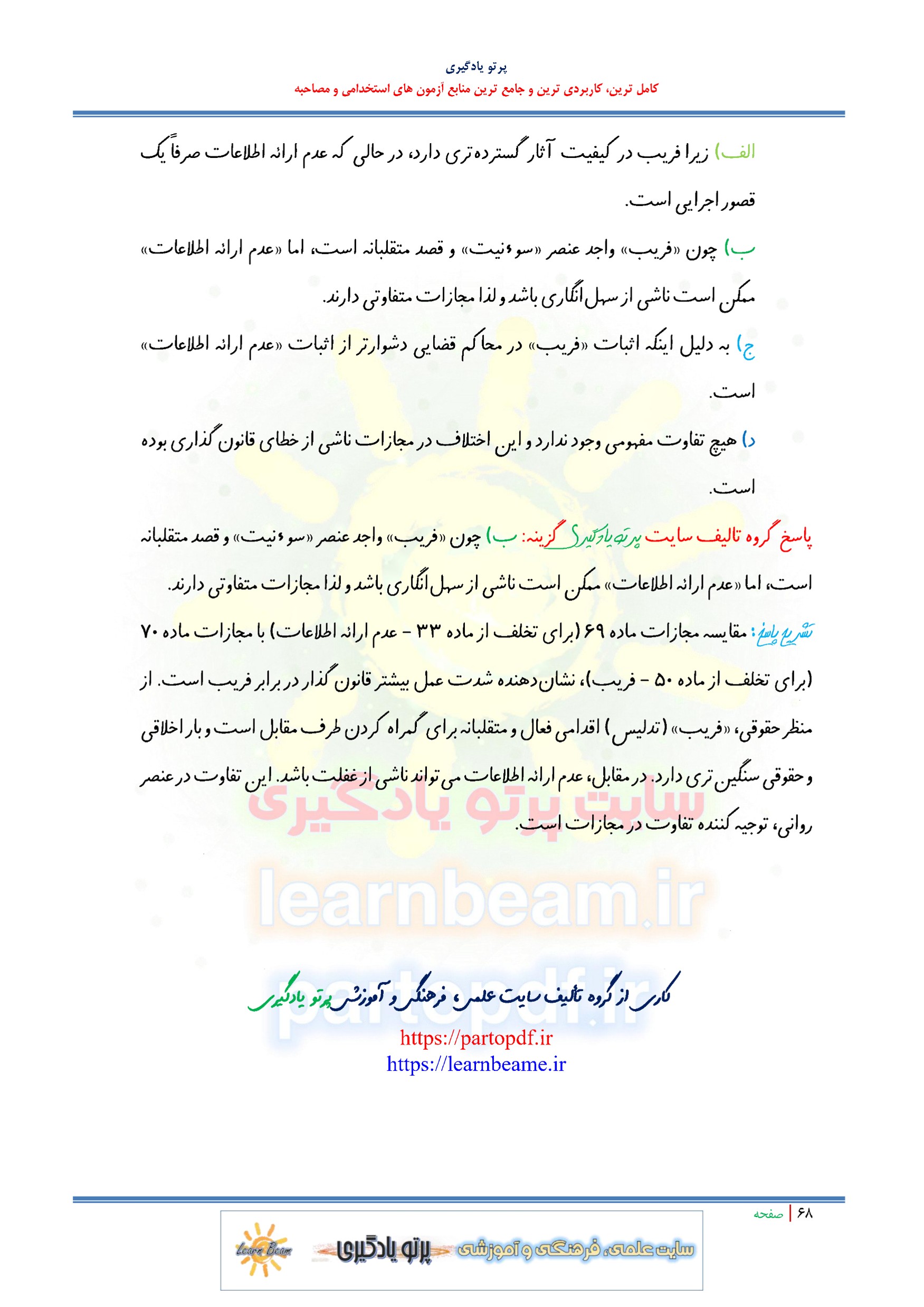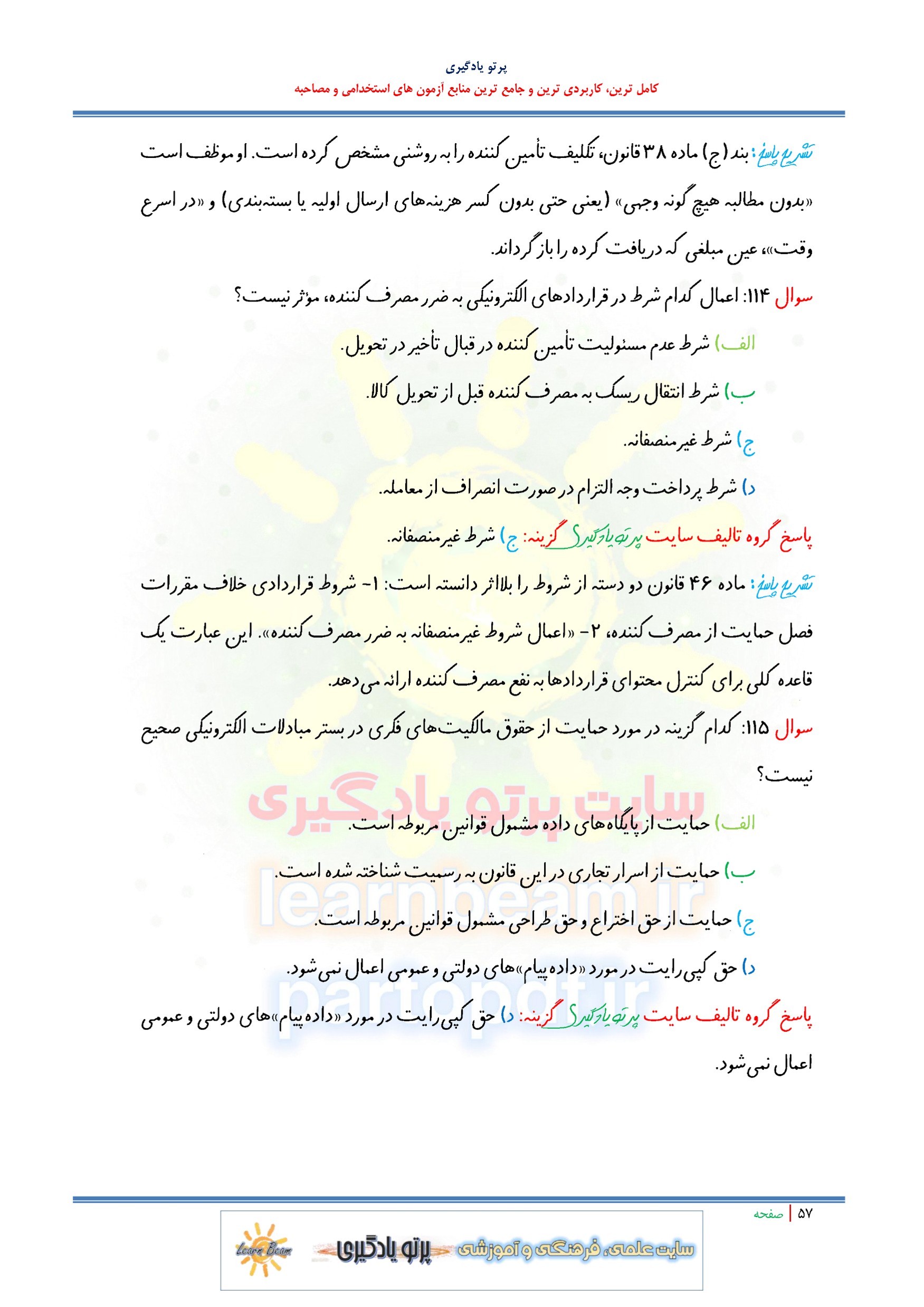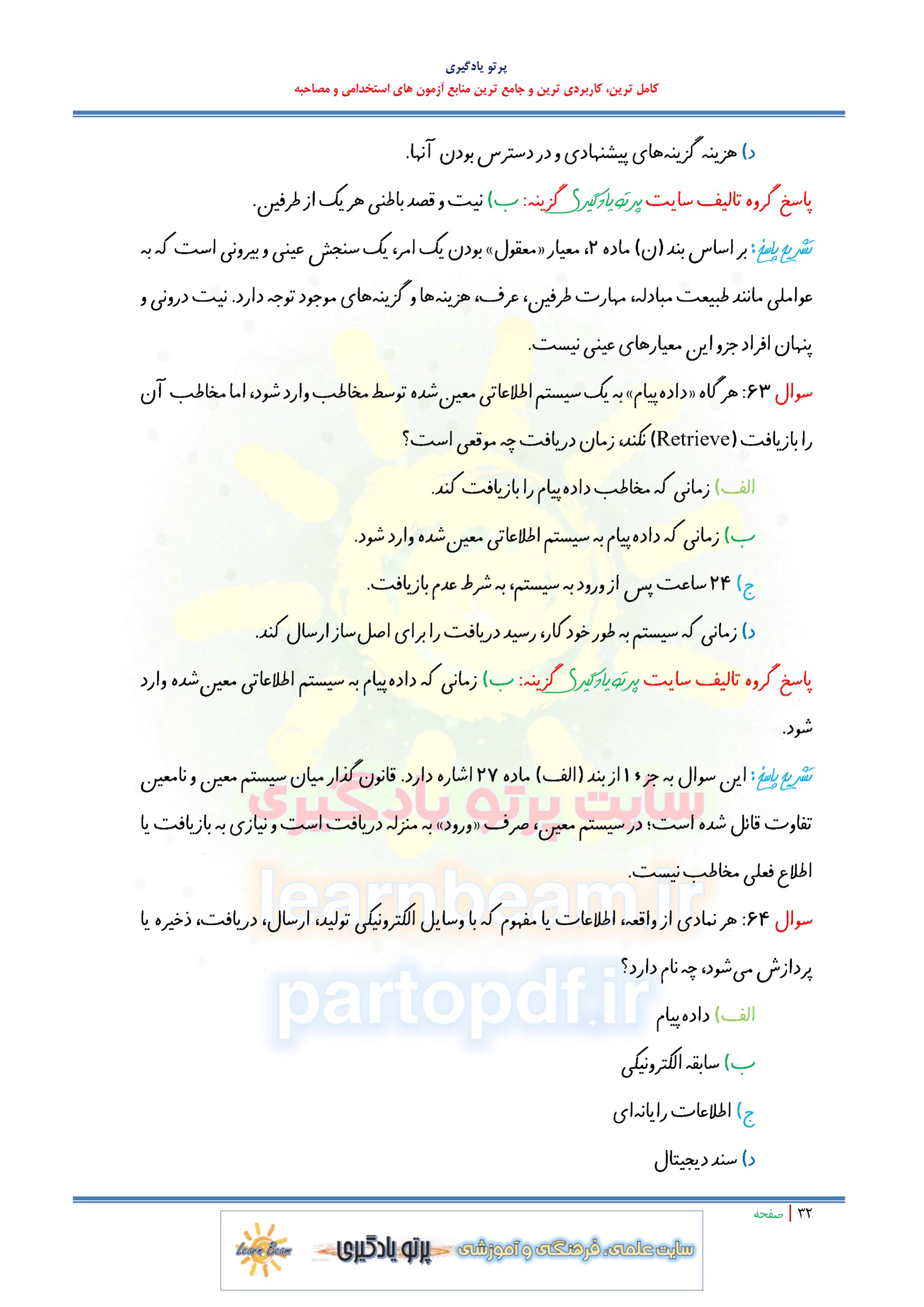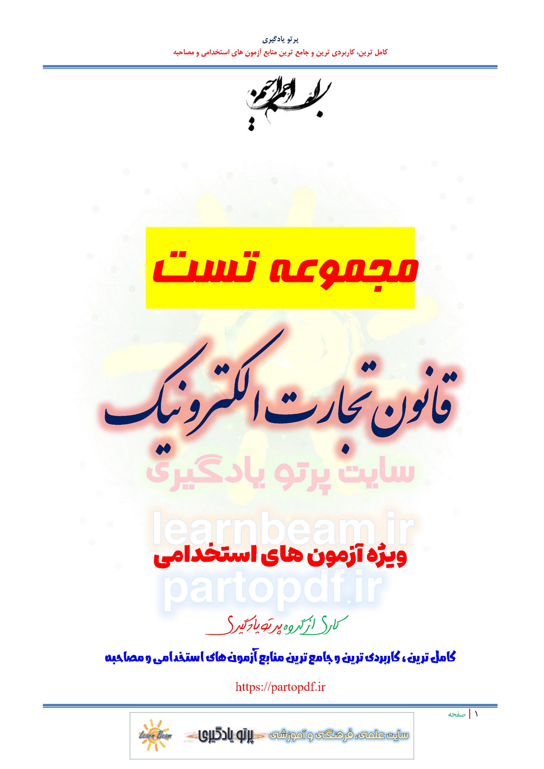 سوالات و تست قانون تجارت الکترونیک سوالات تستی قانون تجارت الکترونیک شامل 100 سوال تستی در 48 صفحه با پاسخ تشریحی در قالب فایل pdf. مطابق با سرفصل های دفترچه آزمون های استخدامی مجموعه سوالات تستی قانون تجارت الکترونیک بهترین منبع برای آمادگی آزمون های استخدامی می باشد. مجموعه سوالات و تست قانون تجارت الکترونیک مطالب خوانده شده داوطلبین آزمون استخدامی را نظم بخشیده و منسجم می سازد. مجموعه سوالات تستی قانون تجارت الکترونیک ویژه آزمون های استخدامی مرور سریع داوطلب را سبب می شود و آگاهی های وی را نظم بخشیده و یک آمادگی و شبیه سازی را برای جلسه آزمون به همراه دارد. مطالعه پک مجموعه سوالات و تست تجارت الکترونیک برای داوطلبین آزمون های استخدامی پیشنهاد می شود.