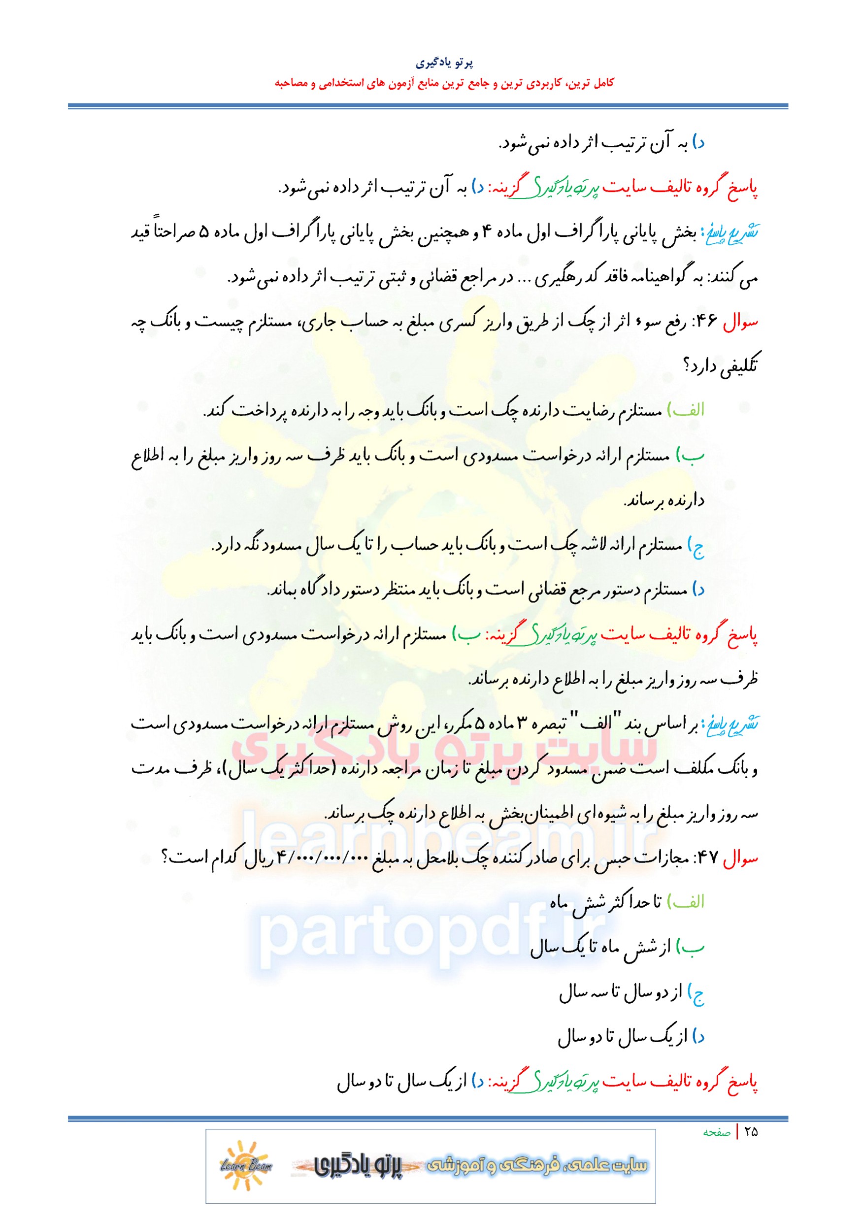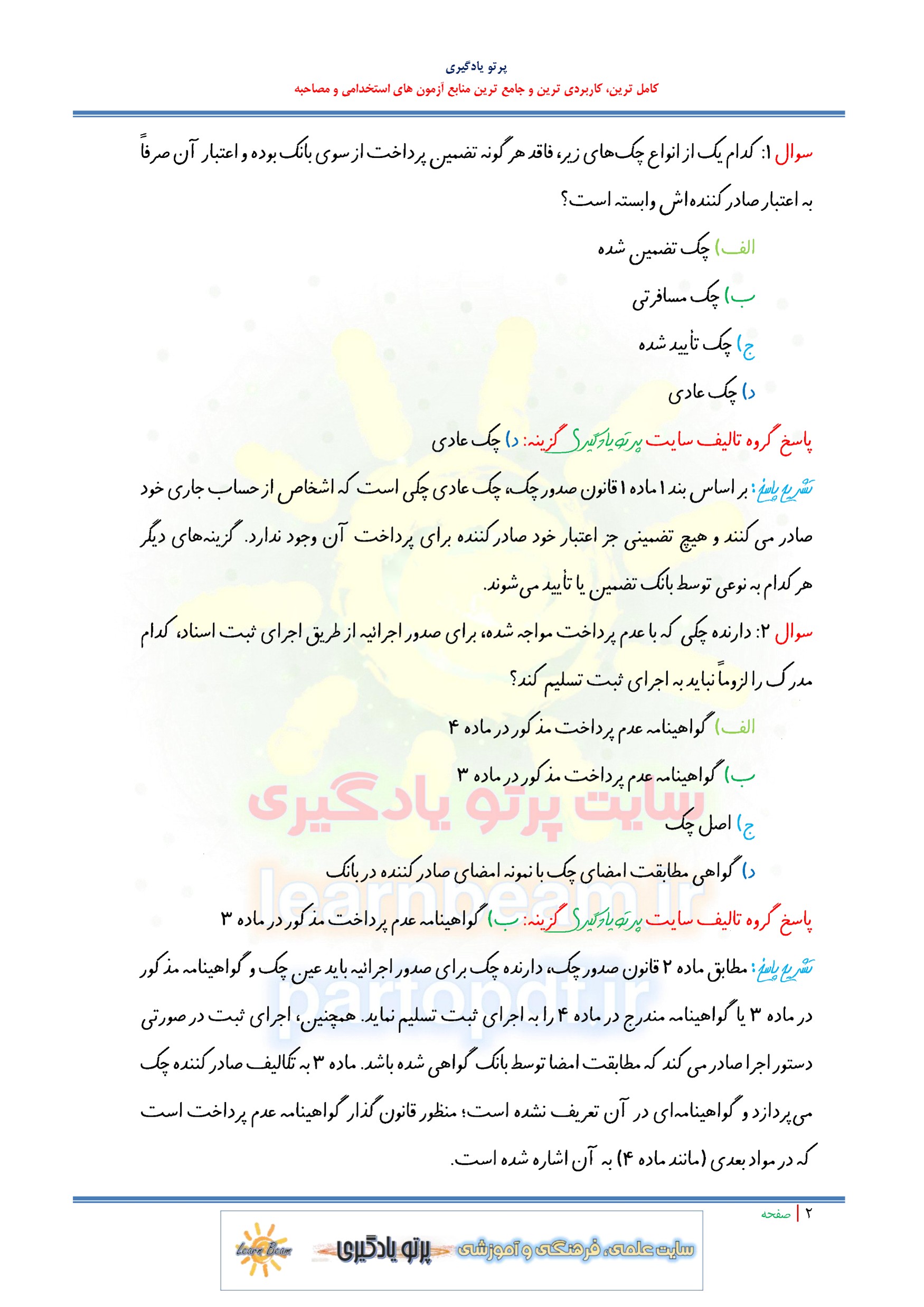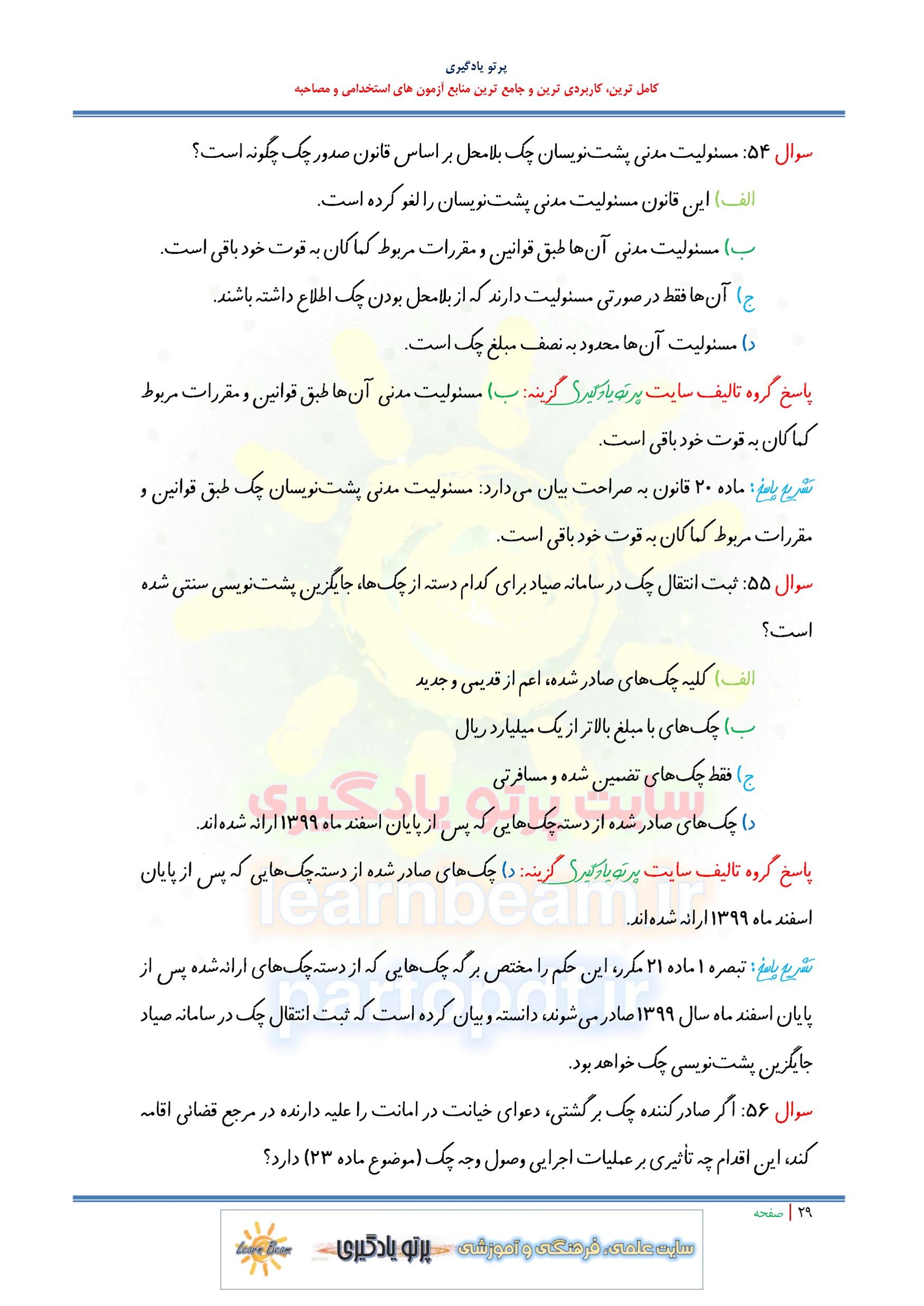 مجموعه سوالات و تست قانون صدور چک مصوبه سال 1355 با اصلاحات و الحاقات بعدی با پاسخ تشریحی
