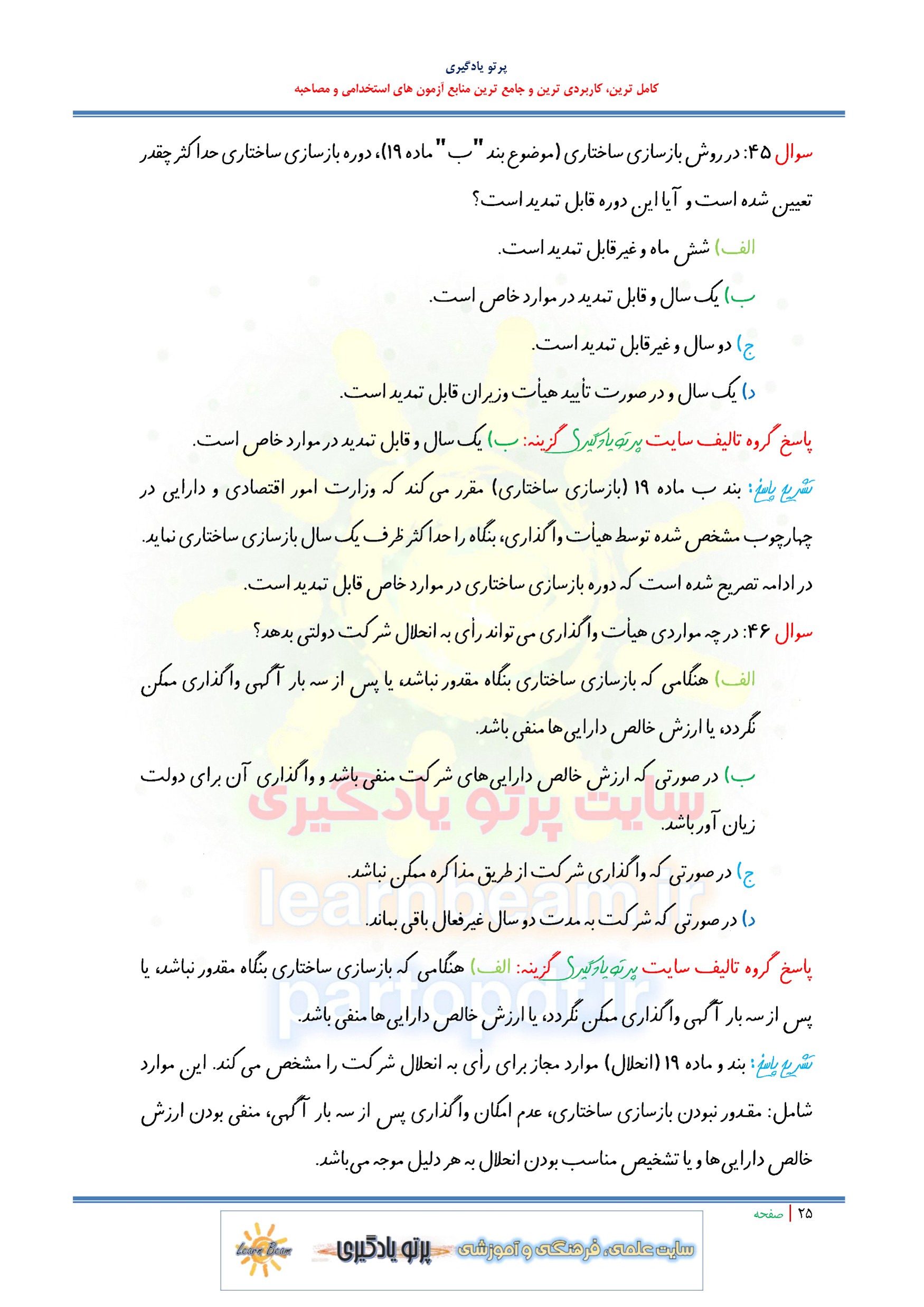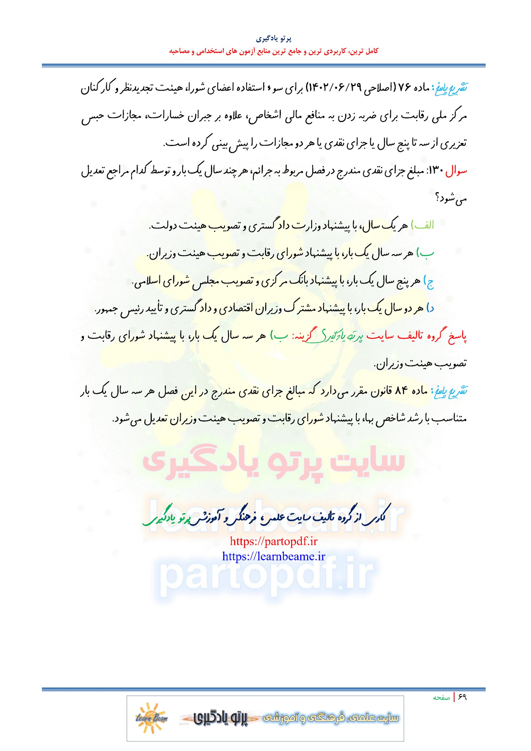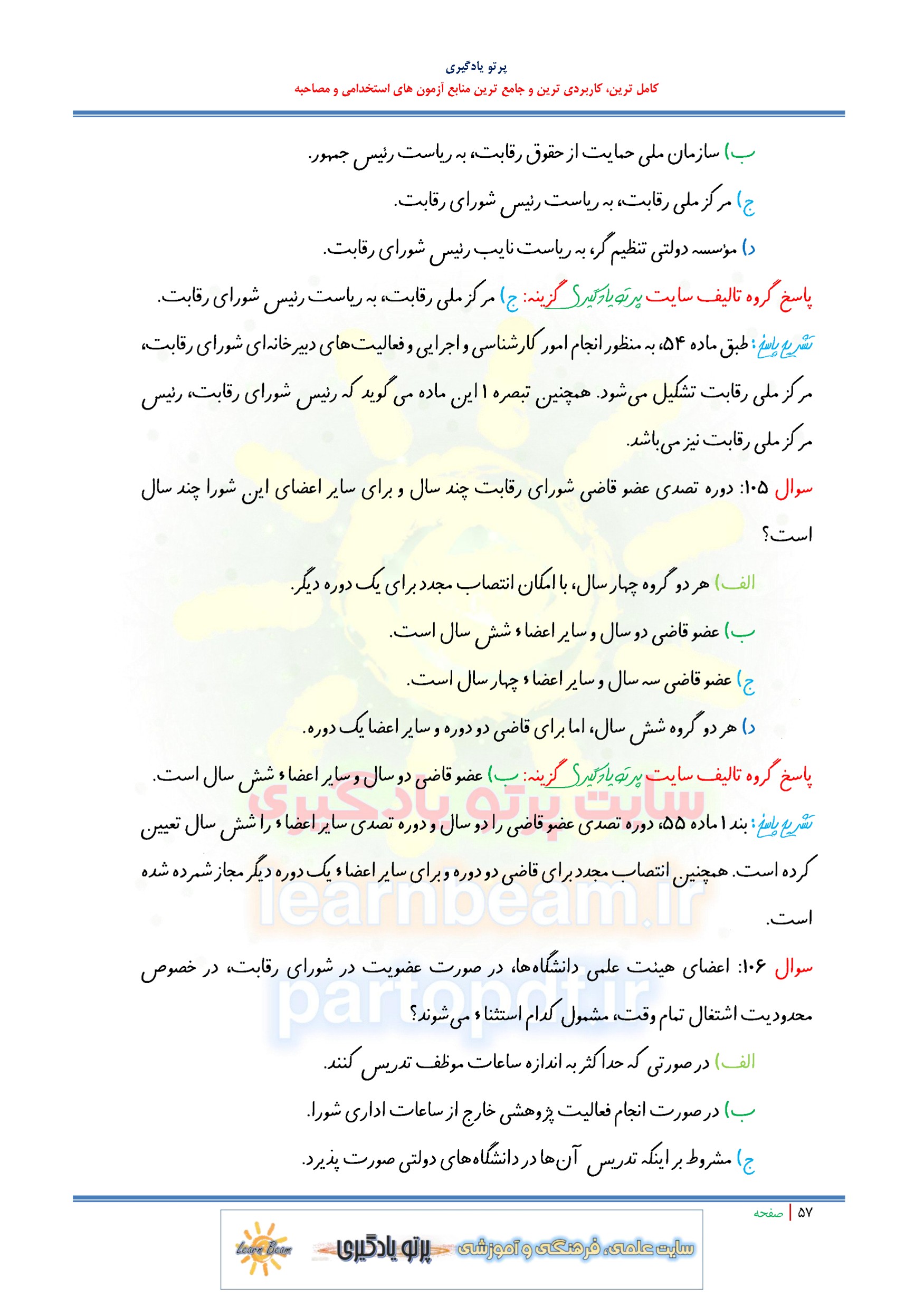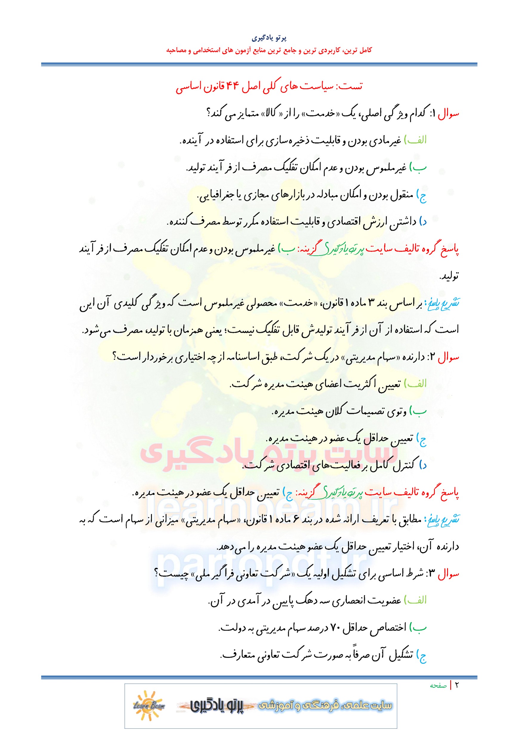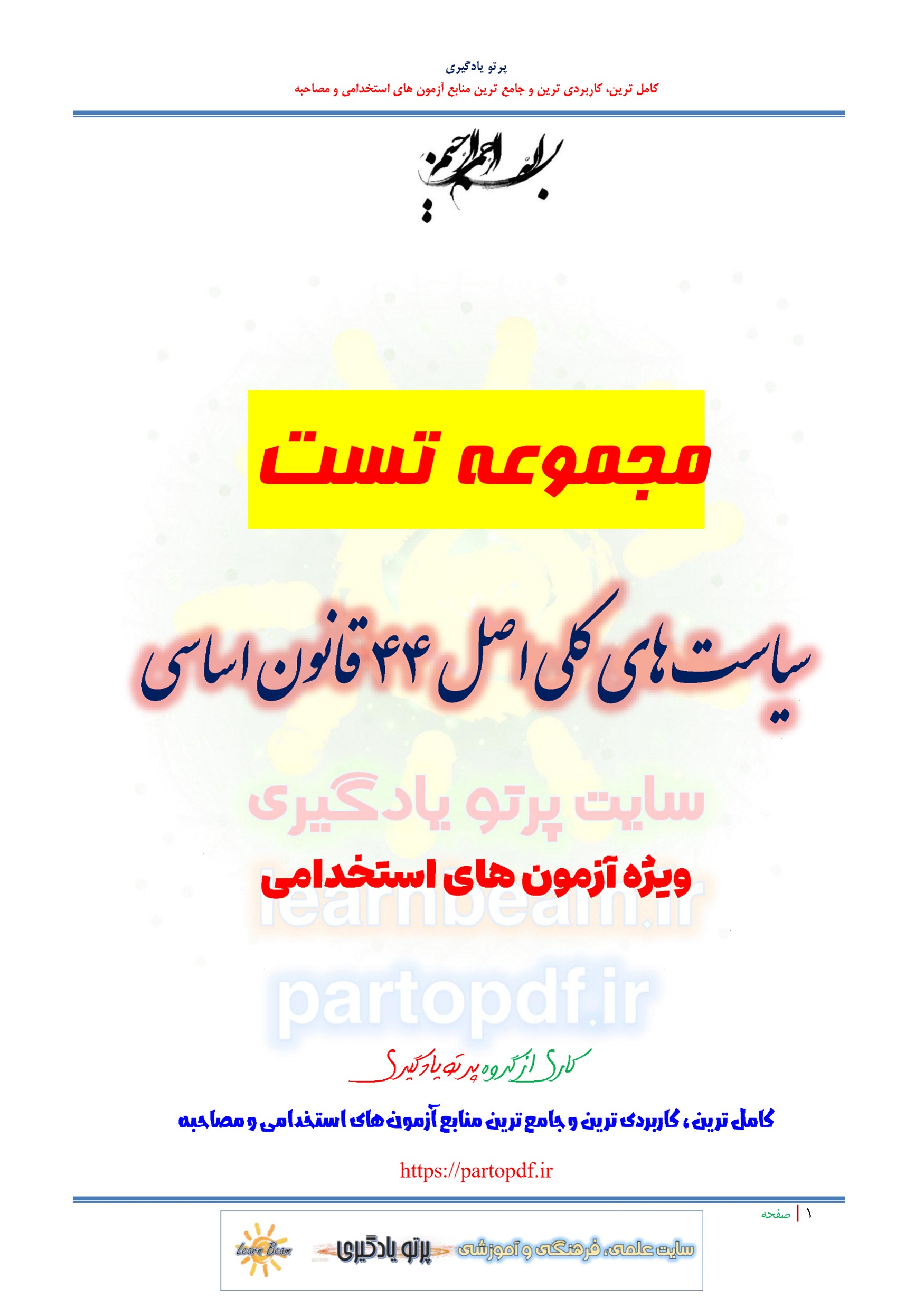 سوالات و تست سیاست های کلی اصل ۴۴ قانون اساسی سوالات سیاست های کلی اصل ۴۴ قانون اساسی شامل 130 سوال تستی در 69 صفحه با پاسخ تشریحی در قالب فایل pdf. بهترین منبع برای آزمون های استخدامی می باشد. مجموعه سوالات تستی سیاست های کلی اصل ۴۴ قانون اساسی مطالب خوانده شده داوطلبین آزمون استخدامی را نظم بخشیده و منسجم می سازد. این مجموعه مرور سریع داوطلب را سبب می شود و آگاهی های وی را نظم بخشیده و یک آمادگی و شبیه سازی را برای جلسه آزمون به همراه دارد. مطالعه این منبع برای همه داوطلبین شرکت کننده در آزمون های استخدامی پیشنهاد می شود.