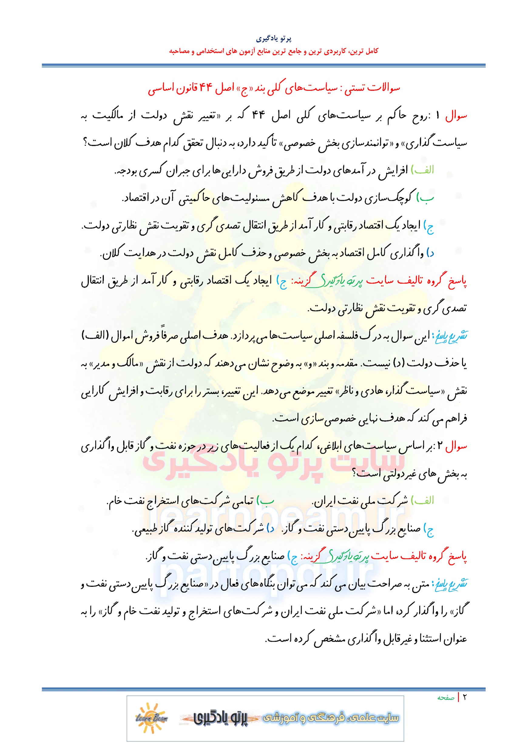 مجموعه سوالات و تست سیاست های کلی بند ج اصل ۴۴ قانون اساسی با پاسخ تشریحی