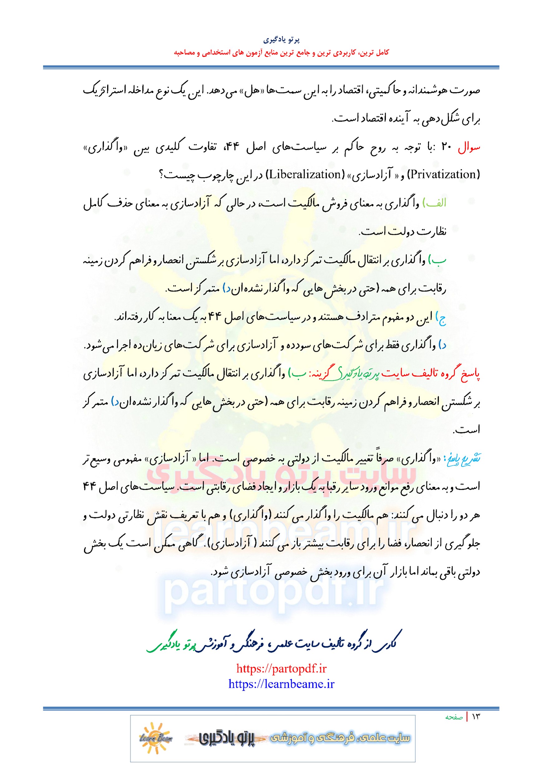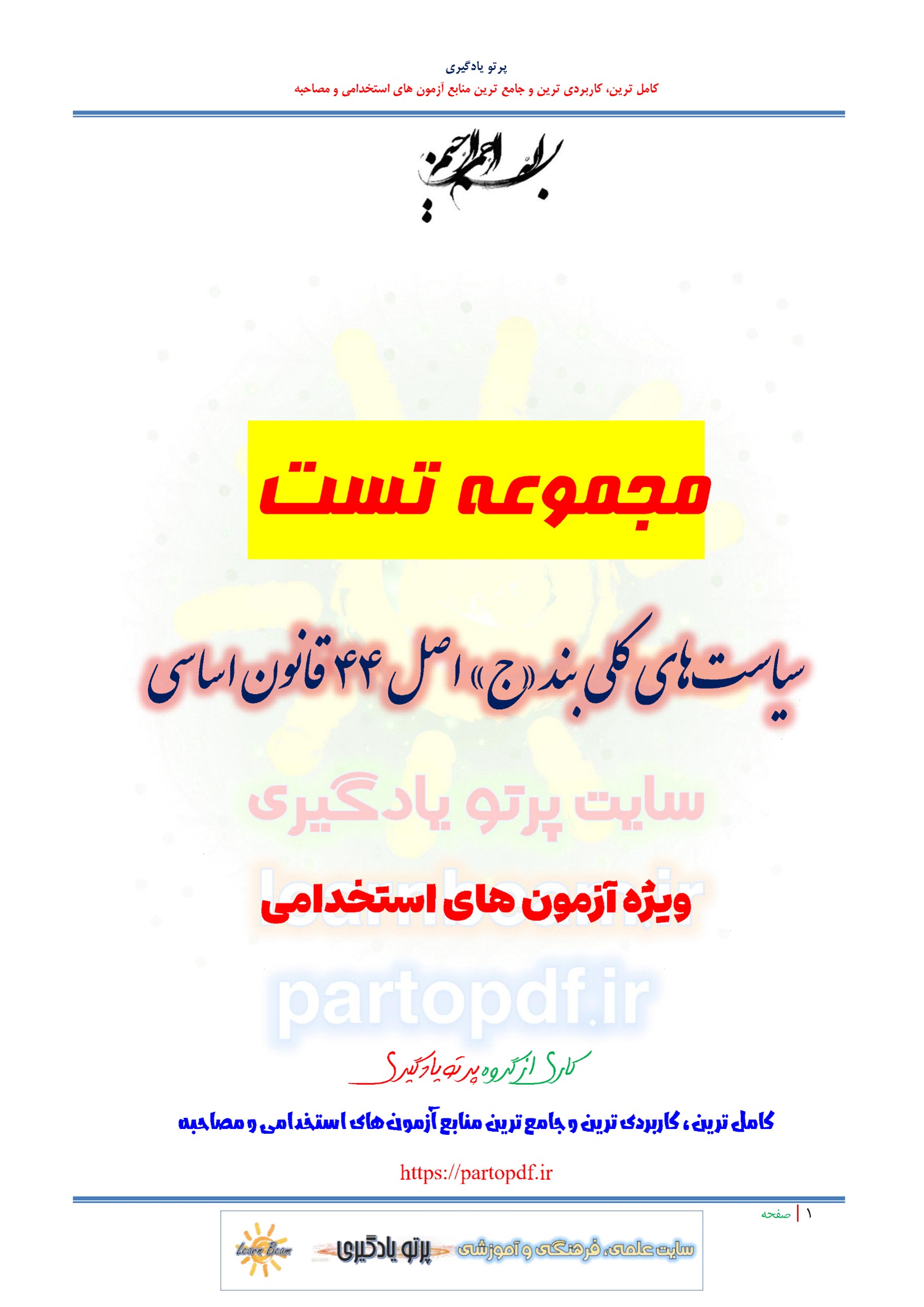 سوالات و تست سیاست های کلی بند ج اصل ۴۴ قانون اساسی سوالات سیاست های کلی بند ج اصل ۴۴ قانون اساسی شامل 20 سوال تستی در 13 صفحه با پاسخ تشریحی در قالب فایل pdf. بهترین منبع برای آزمون های استخدامی می باشد. مجموعه سوالات تستی سیاست های کلی بند ج اصل ۴۴ قانون اساسی مطالب خوانده شده داوطلبین آزمون استخدامی را نظم بخشیده و منسجم می سازد. این مجموعه مرور سریع داوطلب را سبب می شود و آگاهی های وی را نظم بخشیده و یک آمادگی و شبیه سازی را برای جلسه آزمون به همراه دارد. مطالعه این منبع برای همه داوطلبین شرکت کننده در آزمون های استخدامی پیشنهاد می شود.