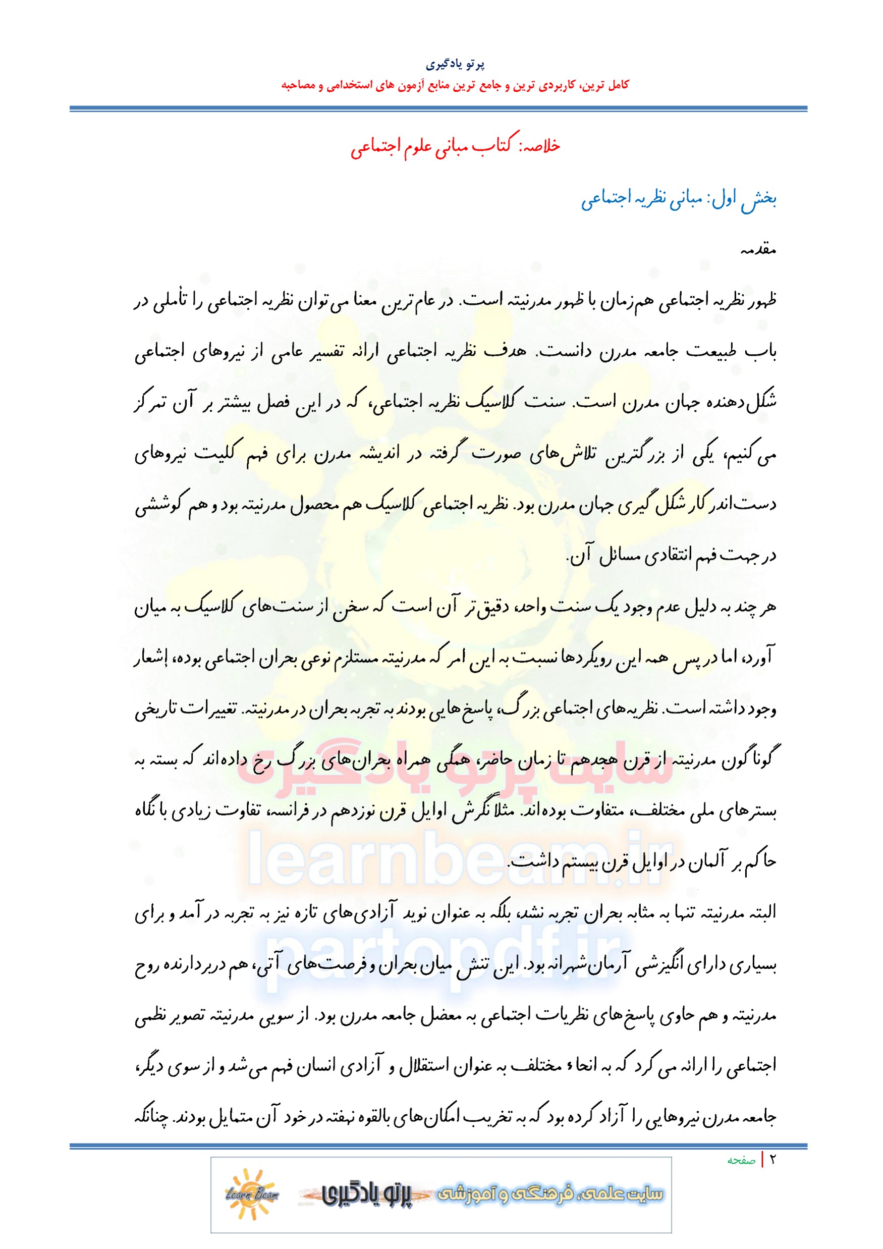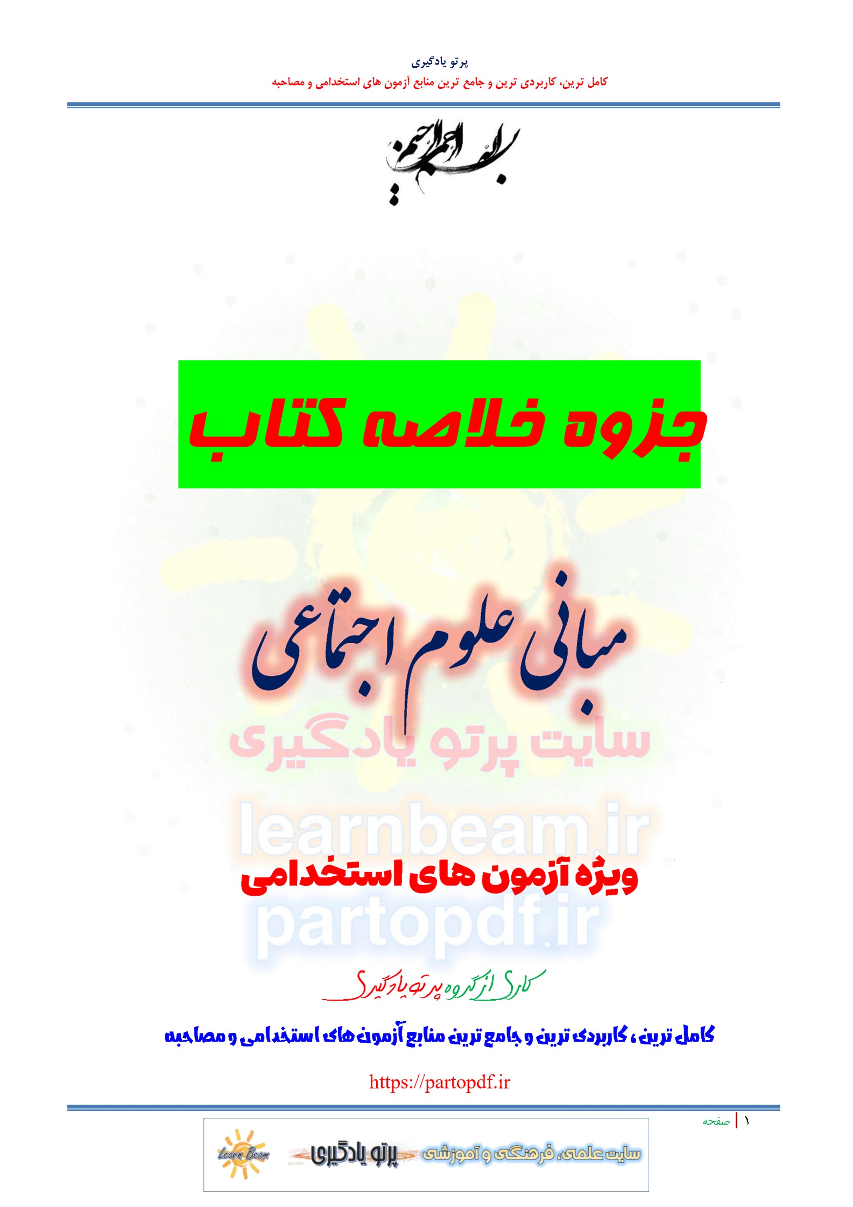 خلاصه کتاب مبانی علوم اجتماعی در 84 صفحه در قالب pdf. مجموعه ای کامل برای مطالعه و موفقیت در آزمون های استخدامی است. این مجموعه ارزشمند در قالب فایل پی دی اف می تواند مناسب ترین انتخاب برای انسجام ذهنی و آمادگی برای آزمون شما عزیزان باشد. مجموعه خلاصه و نکات کلیدی کتاب مبانی علوم اجتماعی برای تجمیع، جمع بندی و مرور سریع متناسب با سرفصل های اعلامی آزمون استخدامی طراحی و تدوین شده است.
