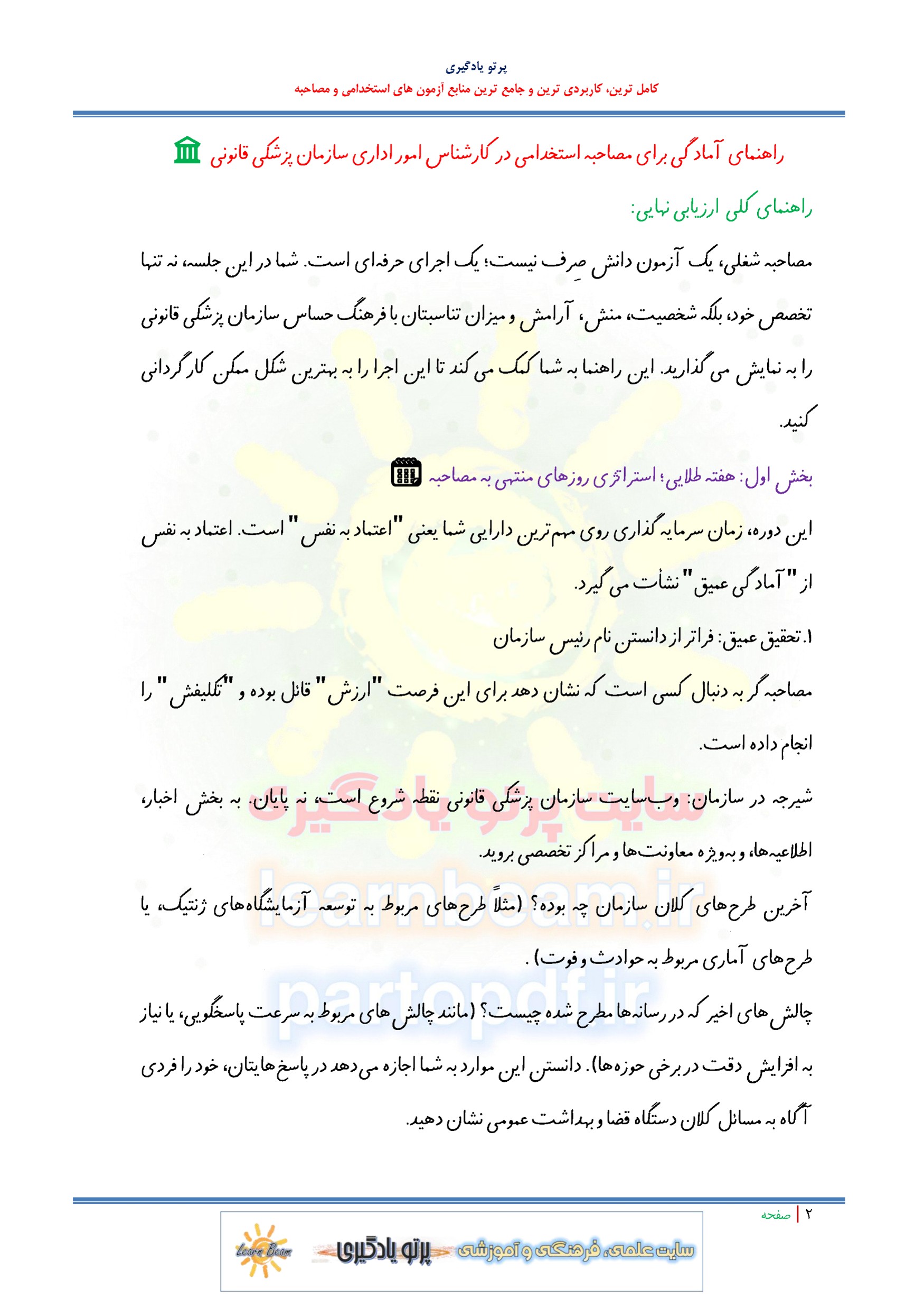 جزوه مصاحبه استخدامی کارشناس امور اداری استخدامی سازمان پزشکی قانونی کشور. مجموعه سوالات آمادگی برای مصاحبه استخدامی کارشناس امور اداری استخدامی سازمان پزشکی قانونی کشور شامل سوال و جواب با پاسخ پیشنهادی توضیحی در 94 صفحه در قالب فایل pdf. شامل سوالات عمومی - روانشناسی و تخصصی در قالب سوالات شایسته محور و تخصصی. شامل: سوالات مصاحبه کارشناس امور اداری استخدامی سازمان پزشکی قانونی کشور. مجموعه سوالات آمادگی برای مصاحبه کارشناس امور اداری استخدامی سازمان پزشکی قانونی کشور برای حضور توانمند عزیزان در کانون مصاحبه تالیف گردیده است. تلاش گروه پرتو یادگیری با تهیه پک کامل این مصاحبه، راحتی و دستیابی عادلانه همه داوطلبین این آزمون استخدامی به منابع کامل می باشد. ضمن آرزوی موفقیت برای یکایک عزیزان در مصاحبه تخصصی و عمومی پیش رو. مطالعه جزوه مصاحبه استخدامی کارشناس امور اداری استخدامی سازمان پزشکی قانونی کشور برای داوطلبین عزیز پیشنهاد می گردد.