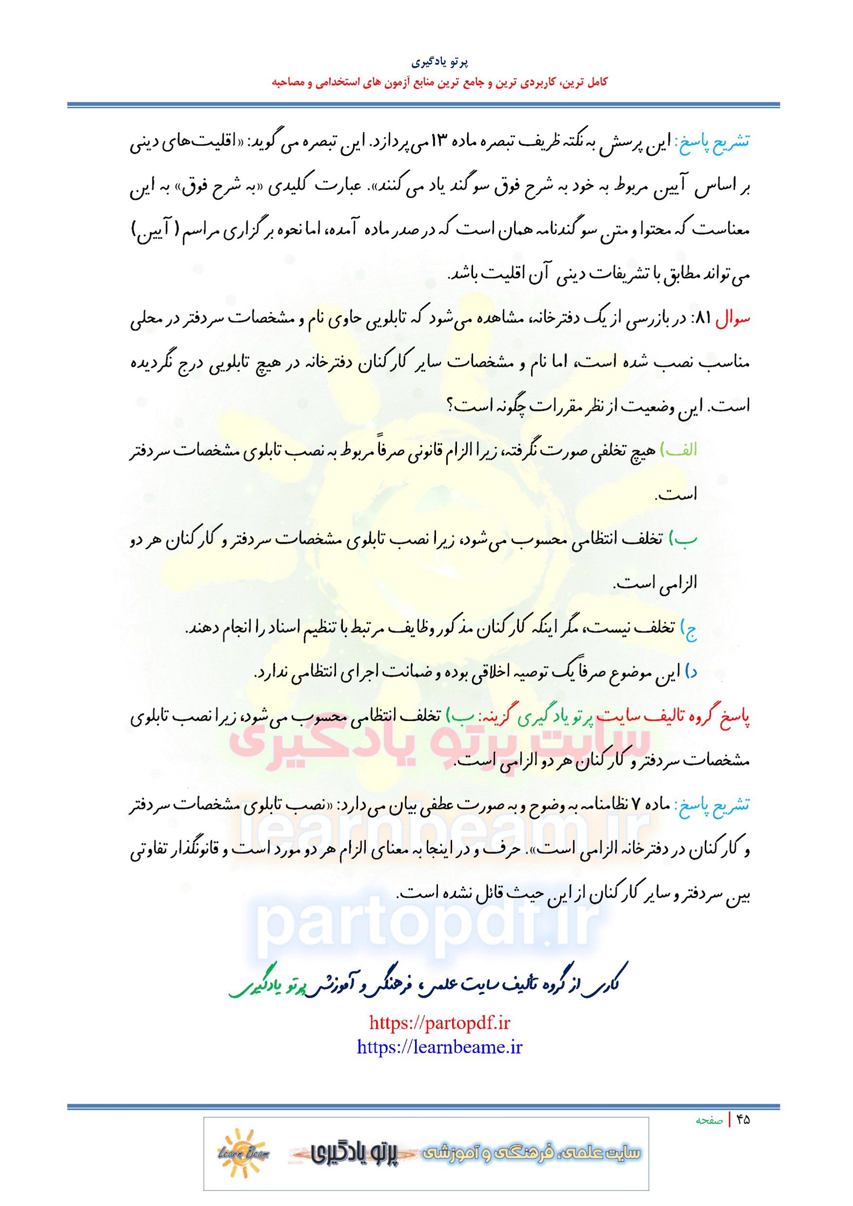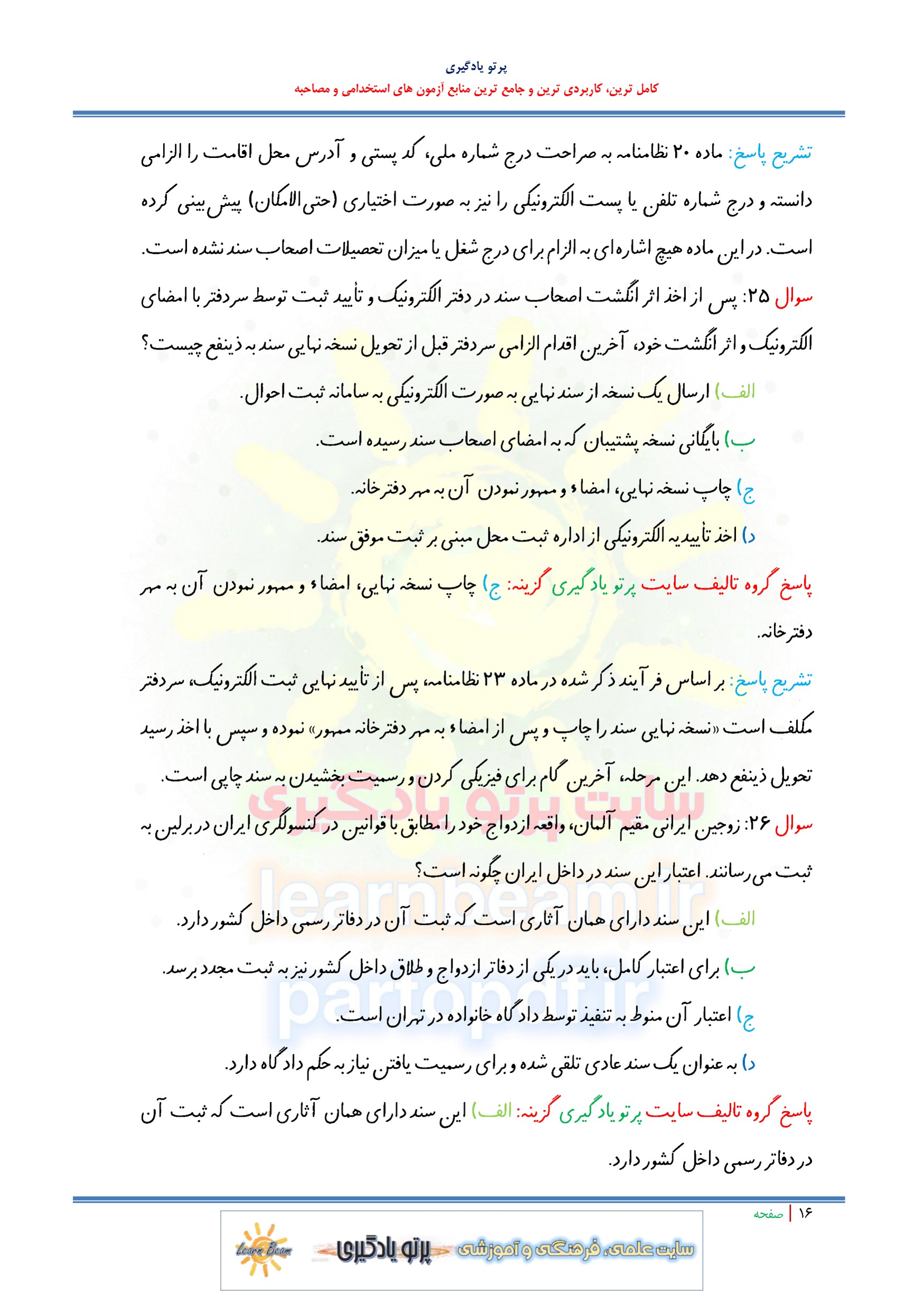 سوالات و تست نظامنامه تشکیلات دفاتر ازدواج و طلاق سوالات نظامنامه تشکیلات دفاتر ازدواج و طلاق شامل 81 سوال تستی در 45 صفحه با پاسخ تشریحی در قالب فایل pdf. بهترین منبع برای آزمون های استخدامی می باشد. مجموعه سوالات تستی نظامنامه تشکیلات دفاتر ازدواج و طلاق مطالب خوانده شده داوطلبین آزمون استخدامی را نظم بخشیده و منسجم می سازد. این مجموعه مرور سریع داوطلب را سبب می شود و آگاهی های وی را نظم بخشیده و یک آمادگی و شبیه سازی را برای جلسه آزمون به همراه دارد. مطالعه این منبع برای همه داوطلبین شرکت کننده در آزمون های استخدامی پیشنهاد می شود.