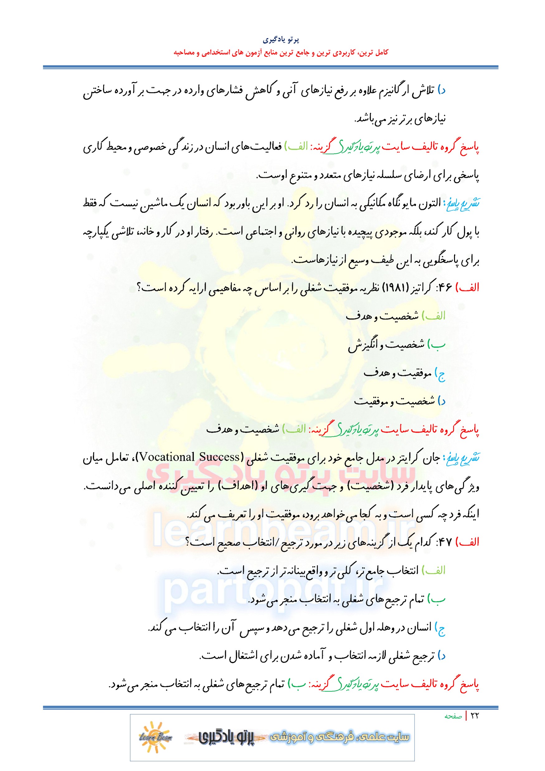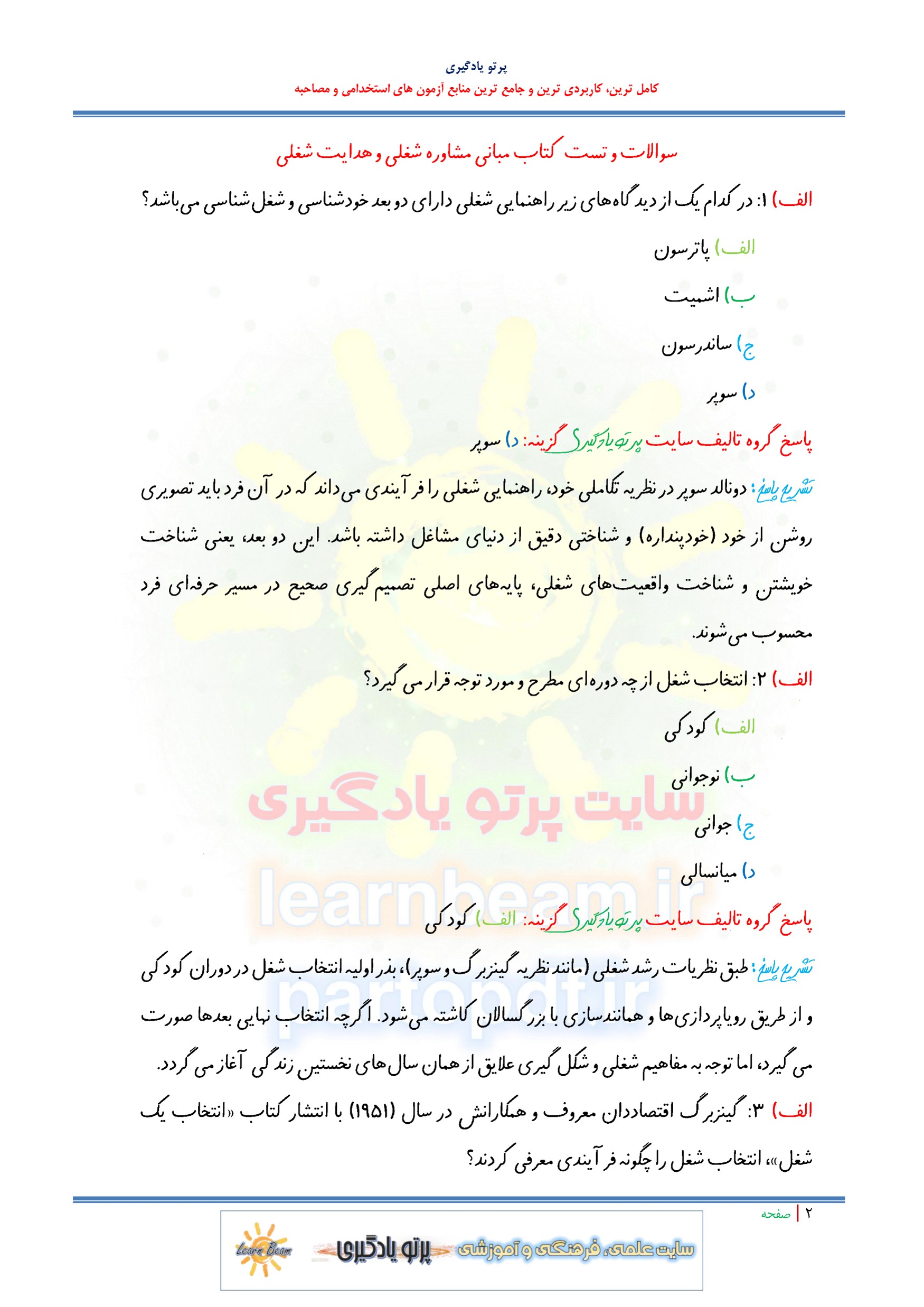 مجموعه سوالات و تست کتاب مبانی مشاوره شغلی و هدایت شغلی با پاسخ تشریحی