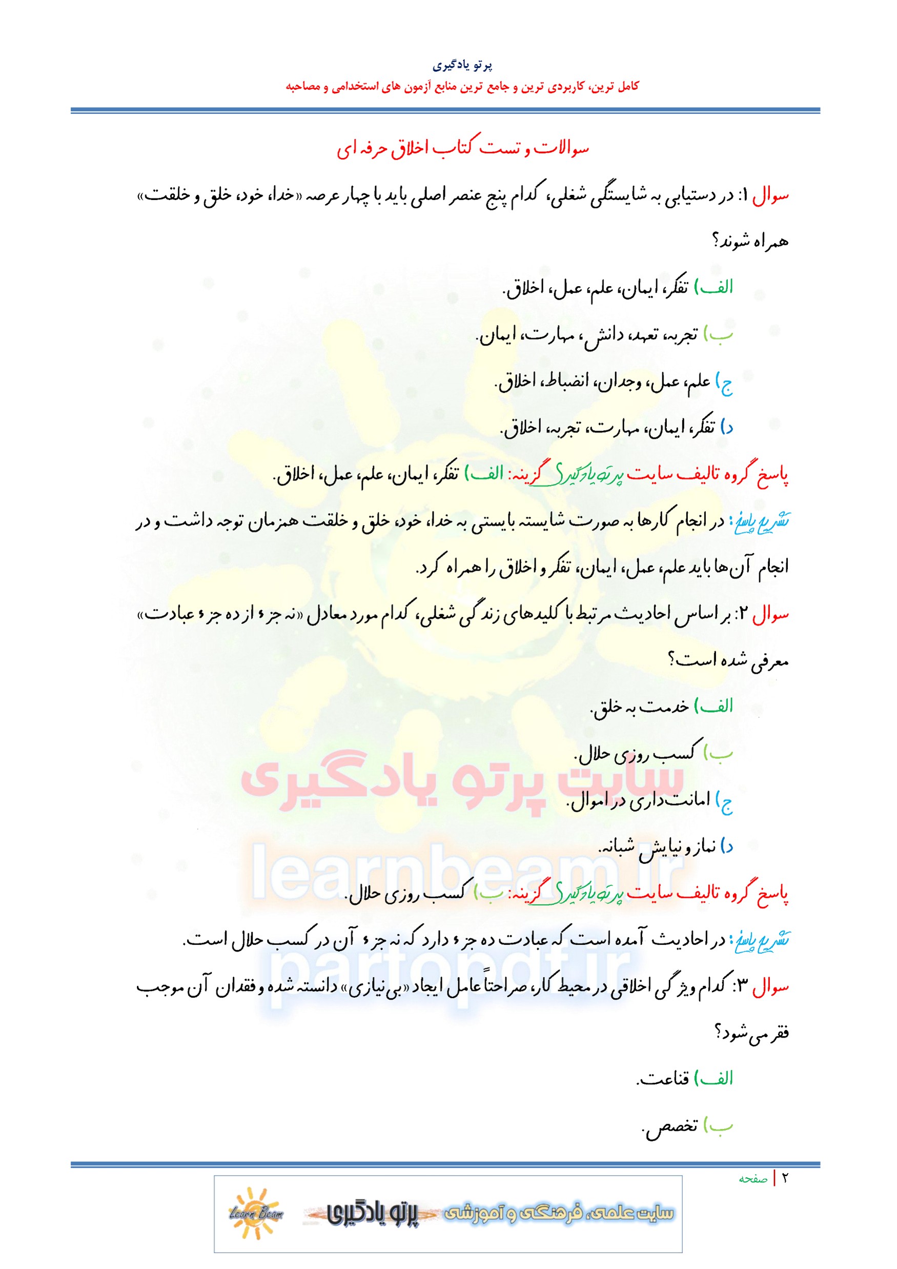 مجموعه سوالات و تست کتاب اخلاق حرفه ای با پاسخ تشریحی