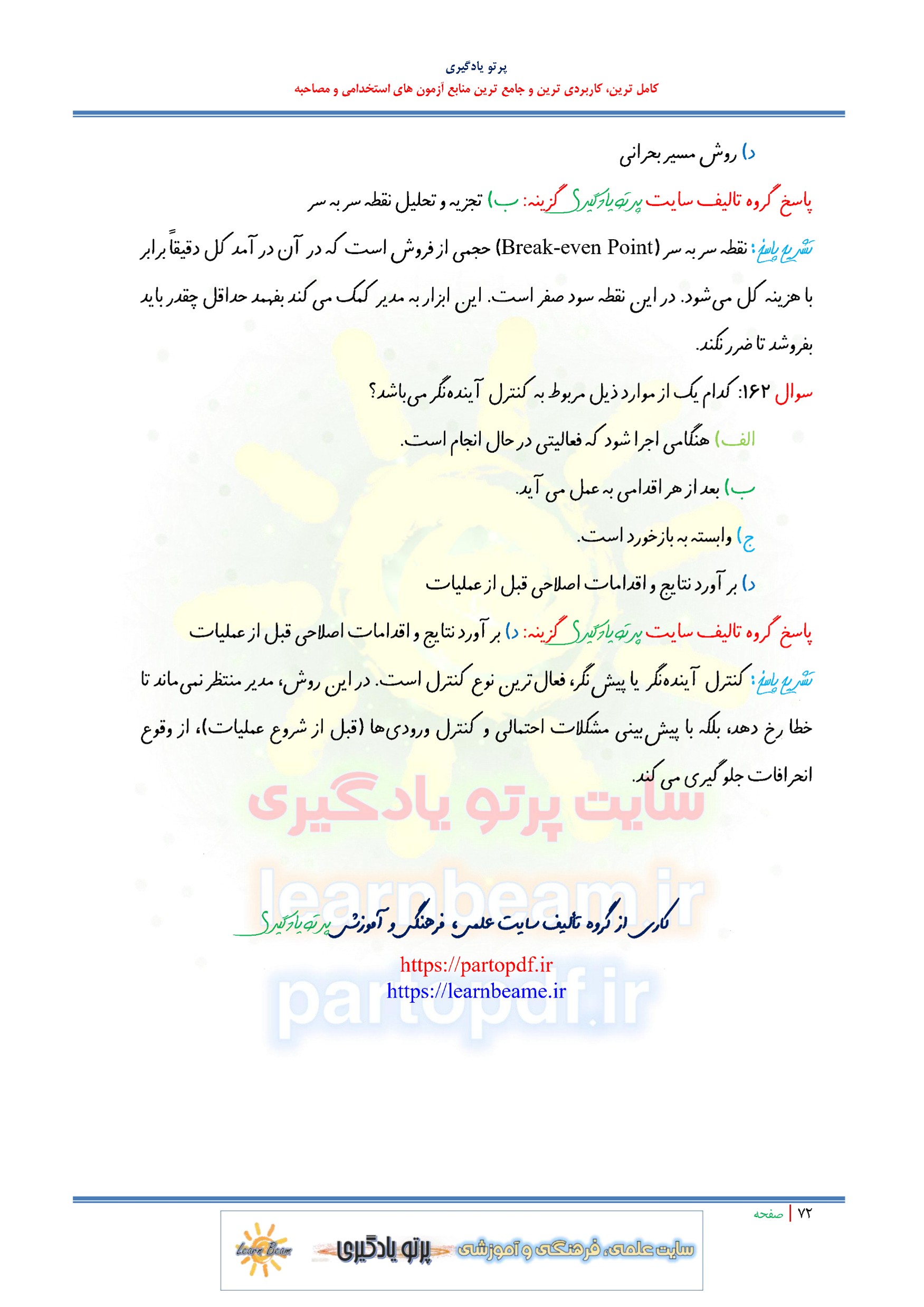 سوالات و تست کتاب اصول و مبانی مدیریت. سوالات تستی کتاب اصول و مبانی مدیریت شامل 162 سوال تستی در 72 صفحه با پاسخ تشریحی در قالب فایل pdf. مطابق با سرفصل های دفترچه آزمون های استخدامی. مجموعه سوالات تستی کتاب اصول و مبانی مدیریت بهترین منبع برای آمادگی آزمون های استخدامی می باشد. مجموعه سوالات و تست کتاب اصول و مبانی مدیریت مطالب خوانده شده داوطلبین آزمون استخدامی را نظم بخشیده و منسجم می سازد. مجموعه سوالات و تست کتاب اصول و مبانی مدیریت ویژه آزمون های استخدامی مرور سریع داوطلب را سبب می شود و آگاهی های وی را نظم بخشیده و یک آمادگی و شبیه سازی را برای جلسه آزمون به همراه دارد. مطالعه پک مجموعه سوالات و تست کتاب اصول و مبانی مدیریت برای داوطلبین آزمون های استخدامی پیشنهاد می شود.