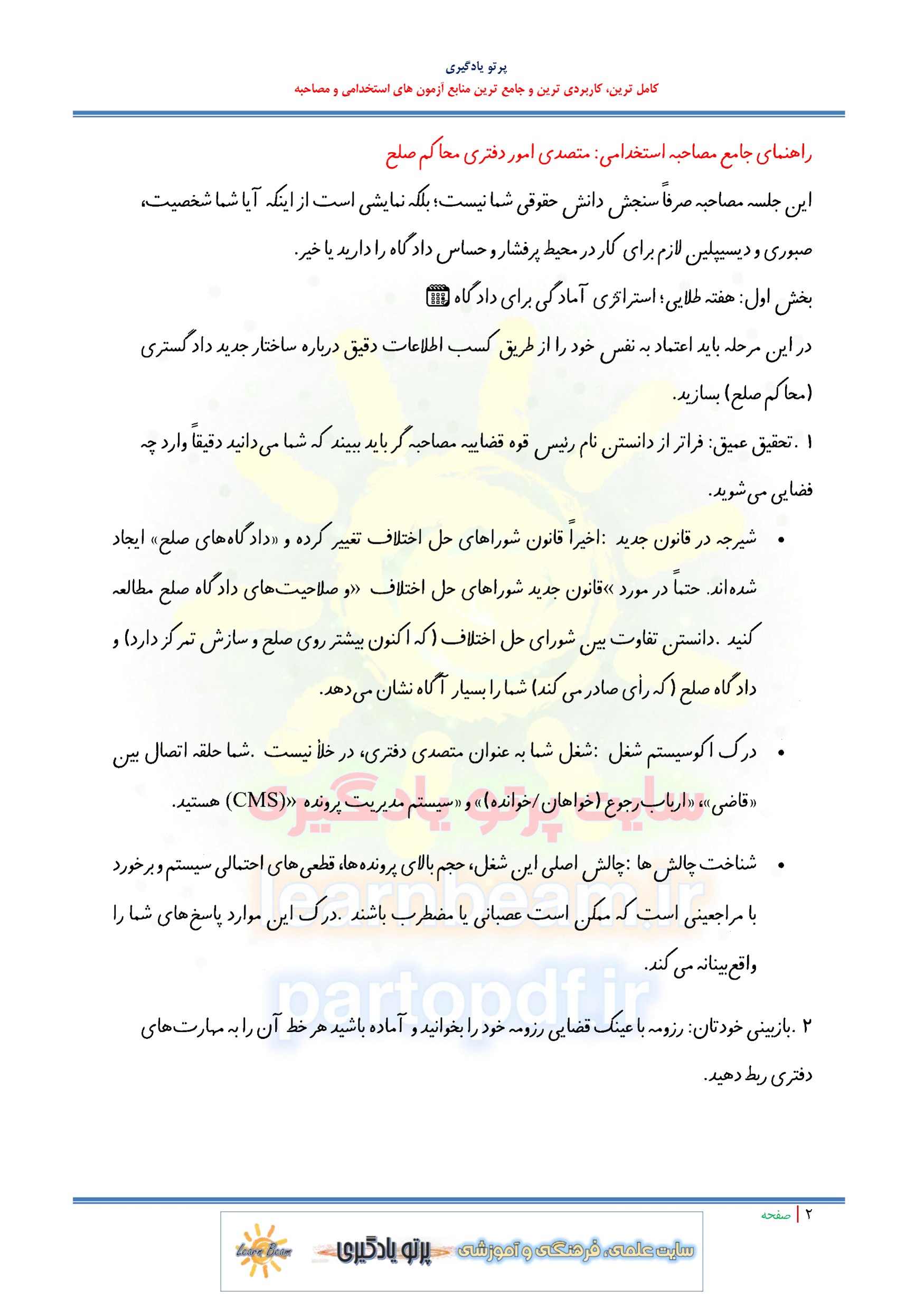 جزوه مصاحبه استخدامی متصدی امور دفتری استخدامی کادر اداری قوه قضاییه سال 1404. مجموعه سوالات آمادگی برای مصاحبه استخدامی متصدی امور دفتری استخدامی کادر اداری قوه قضاییه شامل سوال و جواب با پاسخ پیشنهادی توضیحی در 104 صفحه در قالب فایل pdf. شامل سوالات عمومی - روانشناسی و تخصصی در قالب سوالات شایسته محور و تخصصی. شامل: سوالات مصاحبه متصدی امور دفتری استخدامی کادر اداری قوه قضاییه سال 1404. مجموعه سوالات آمادگی برای مصاحبه متصدی امور دفتری استخدامی کادر اداری قوه قضاییه برای حضور توانمند عزیزان در کانون مصاحبه تالیف گردیده است. تلاش گروه پرتو یادگیری با تهیه پک کامل این مصاحبه، راحتی و دستیابی عادلانه همه داوطلبین این آزمون استخدامی به منابع کامل می باشد. ضمن آرزوی موفقیت برای یکایک عزیزان در مصاحبه تخصصی و عمومی پیش رو. مطالعه جزوه مصاحبه استخدامی متصدی امور دفتری استخدامی کادر اداری قوه قضاییه برای داوطلبین عزیز پیشنهاد می گردد.