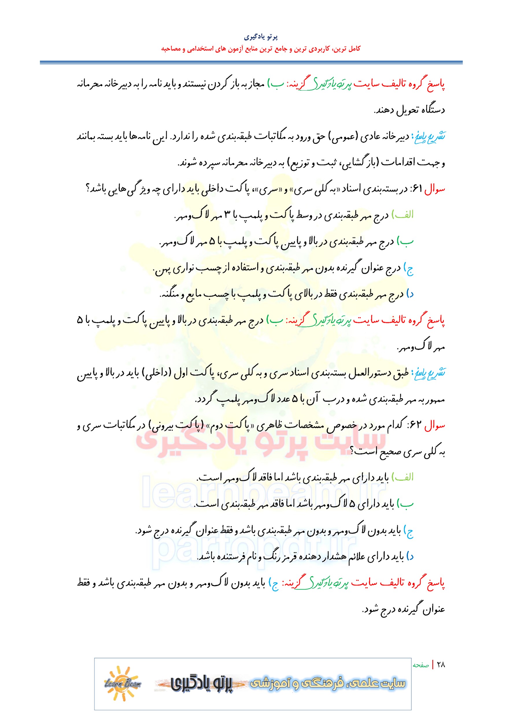 سوالات و تست حفاظت اسناد و مدارک. سوالات تستی حفاظت اسناد و مدارک شامل 160 سوال تستی در 69 صفحه با پاسخ تشریحی در قالب فایل pdf. بهترین منبع برای آزمون های استخدامی می باشد. مجموعه سوالات تستی حفاظت اسناد و مدارک مطالب خوانده شده داوطلبین آزمون استخدامی را نظم بخشیده و منسجم می سازد. این مجموعه مرور سریع داوطلب را سبب می شود و آگاهی های وی را نظم بخشیده و یک آمادگی و شبیه سازی را برای جلسه آزمون به همراه دارد. مطالعه این منبع برای همه داوطلبین شرکت کننده در آزمون های استخدامی پیشنهاد می شود.