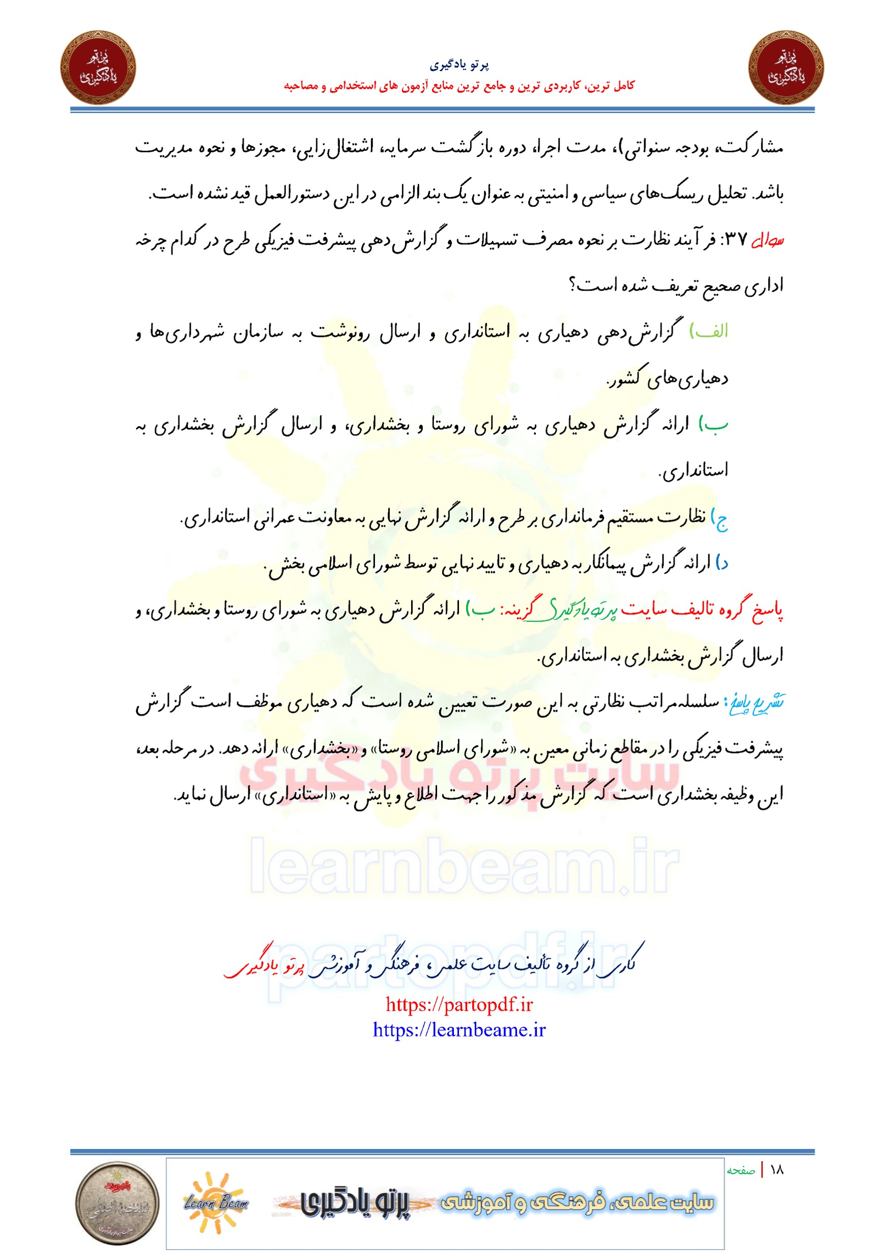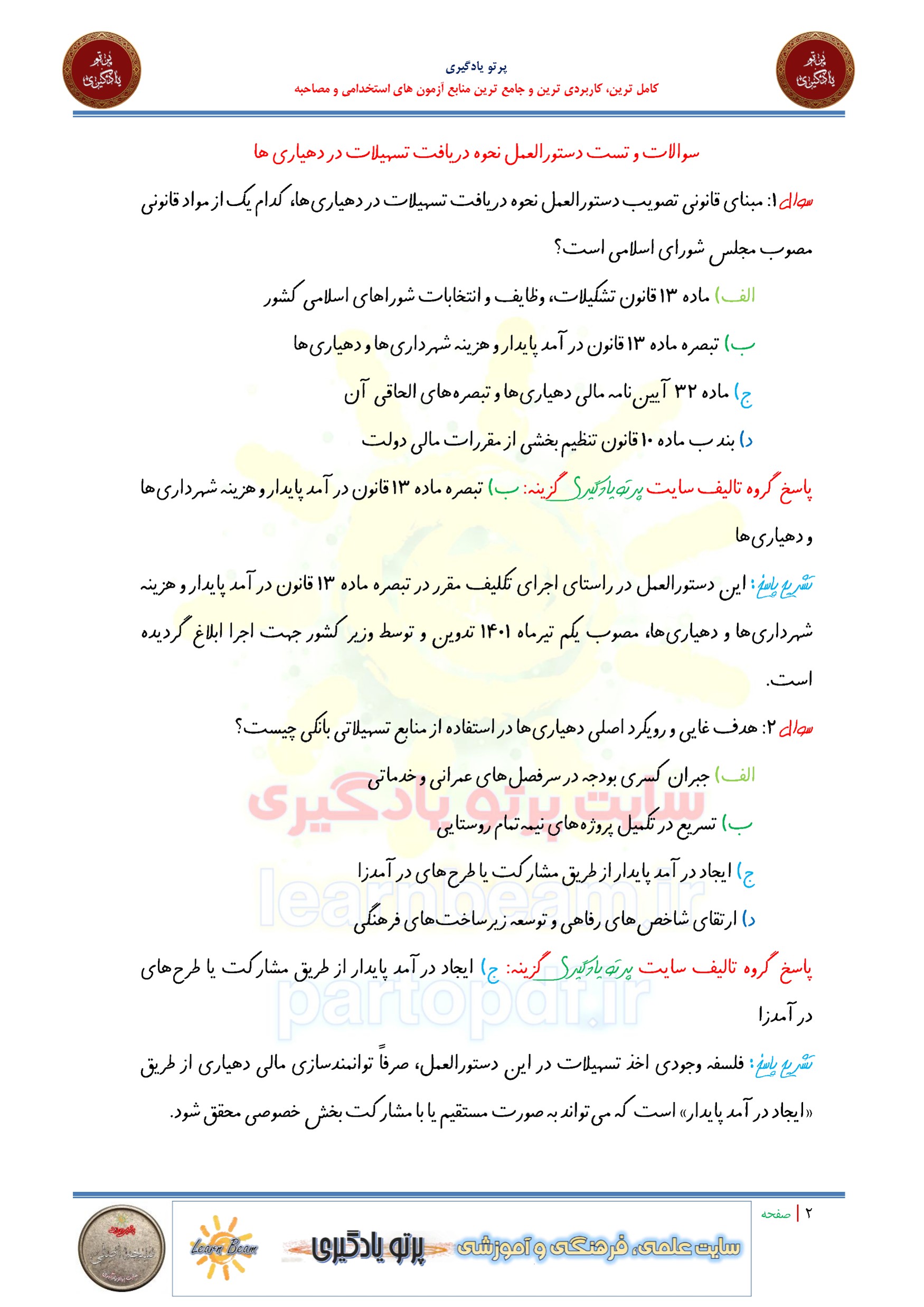 مجموعه سوالات و تست دستورالعمل نحوه دریافت تسهیلات در دهیاری ها با پاسخ تشریحی