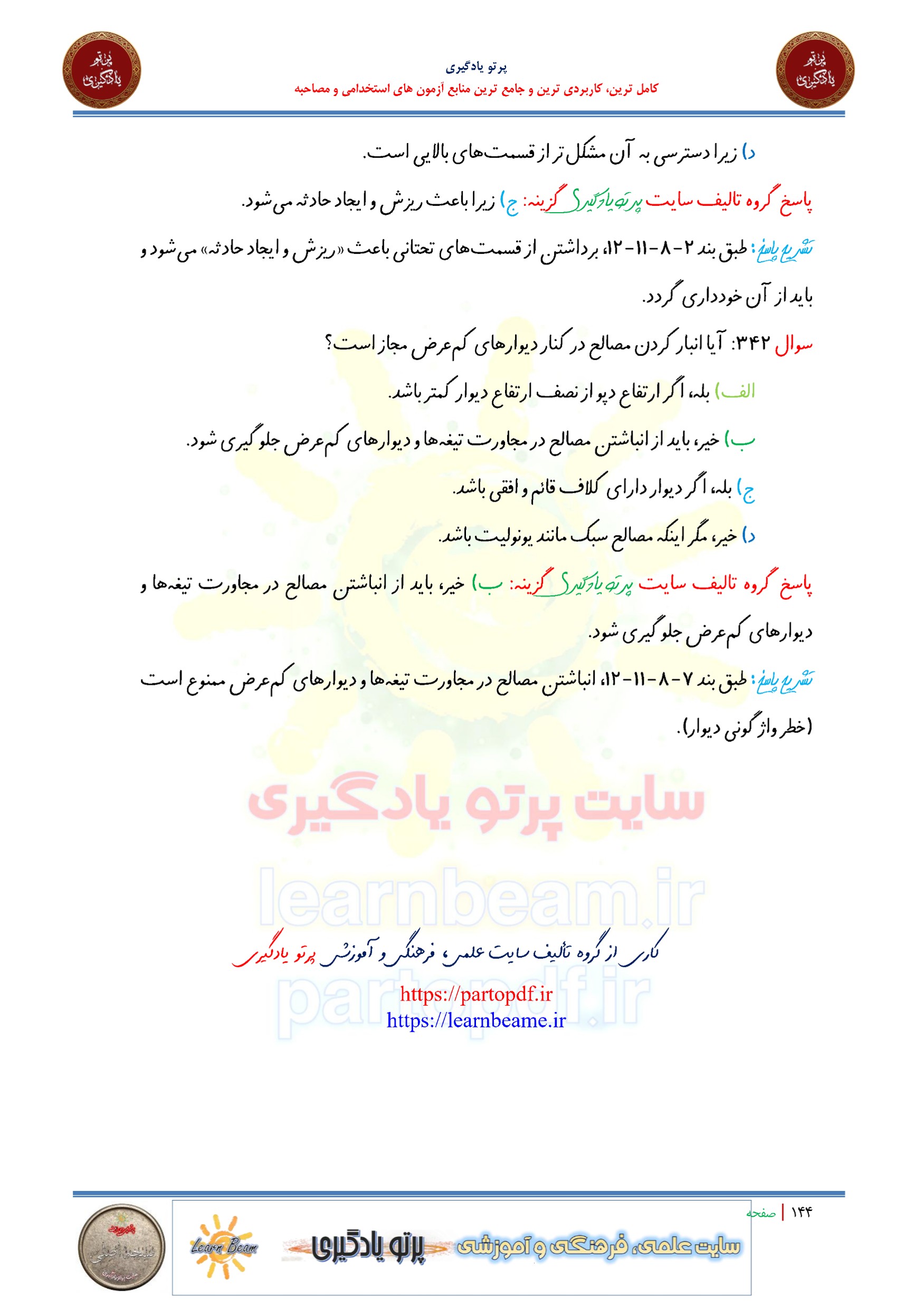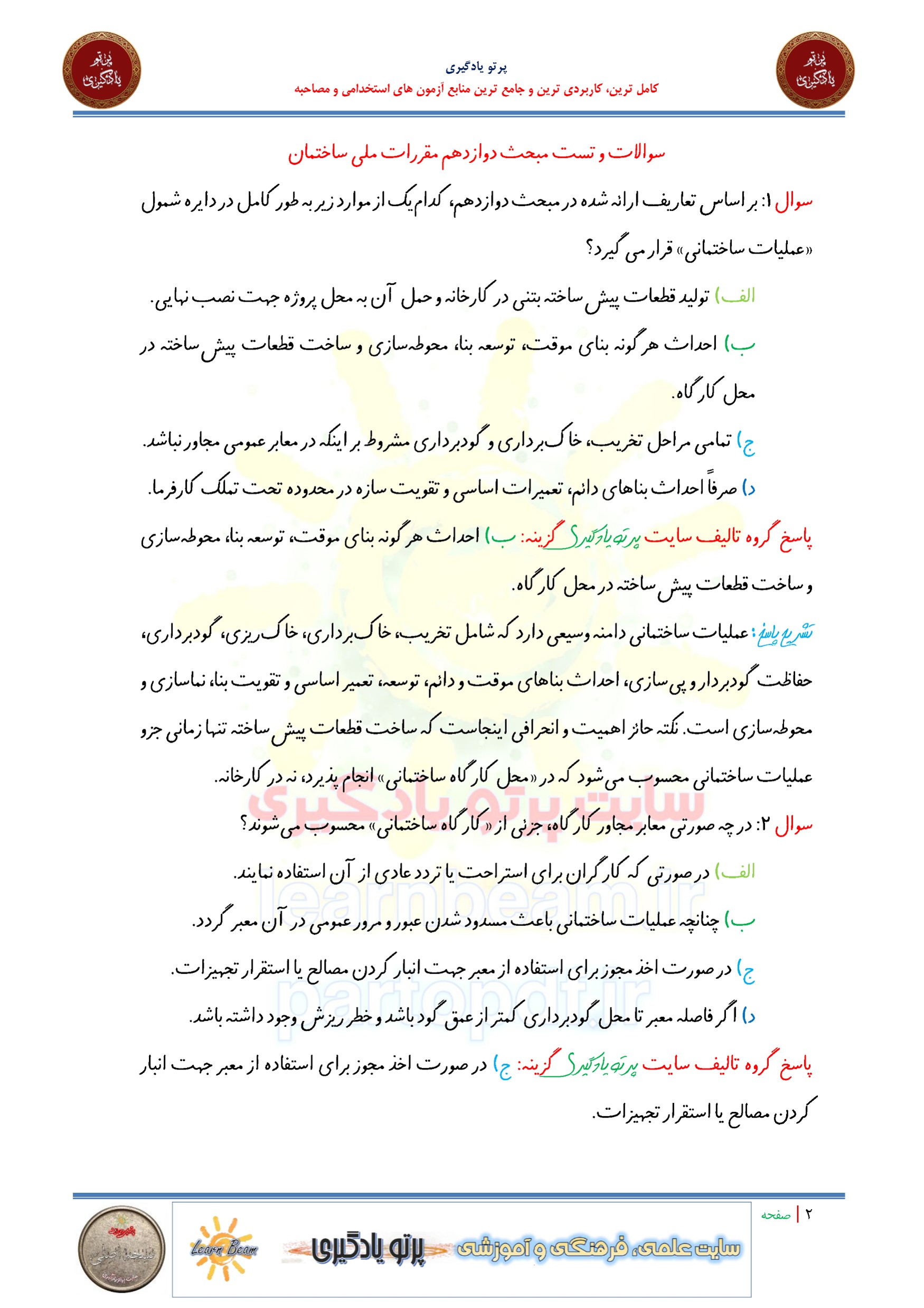 سوالات و تست مقررات ملی ساختمان مبحث دوازدهم. سوالات تستی مبحث دوازدهم مقررات ملی ساختمان شامل 342 سوال تستی در 144 صفحه با پاسخ تشریحی در قالب فایل pdf. بهترین منبع برای آزمون های استخدامی می باشد. مجموعه سوالات تستی مقررات ملی ساختمان مبحث 12 مطالب خوانده شده داوطلبین آزمون استخدامی را نظم بخشیده و منسجم می سازد. این مجموعه مرور سریع داوطلب را سبب می شود و آگاهی های وی را نظم بخشیده و یک آمادگی و شبیه سازی را برای جلسه آزمون به همراه دارد. مطالعه این منبع برای همه داوطلبین شرکت کننده در آزمون های استخدامی پیشنهاد می شود.