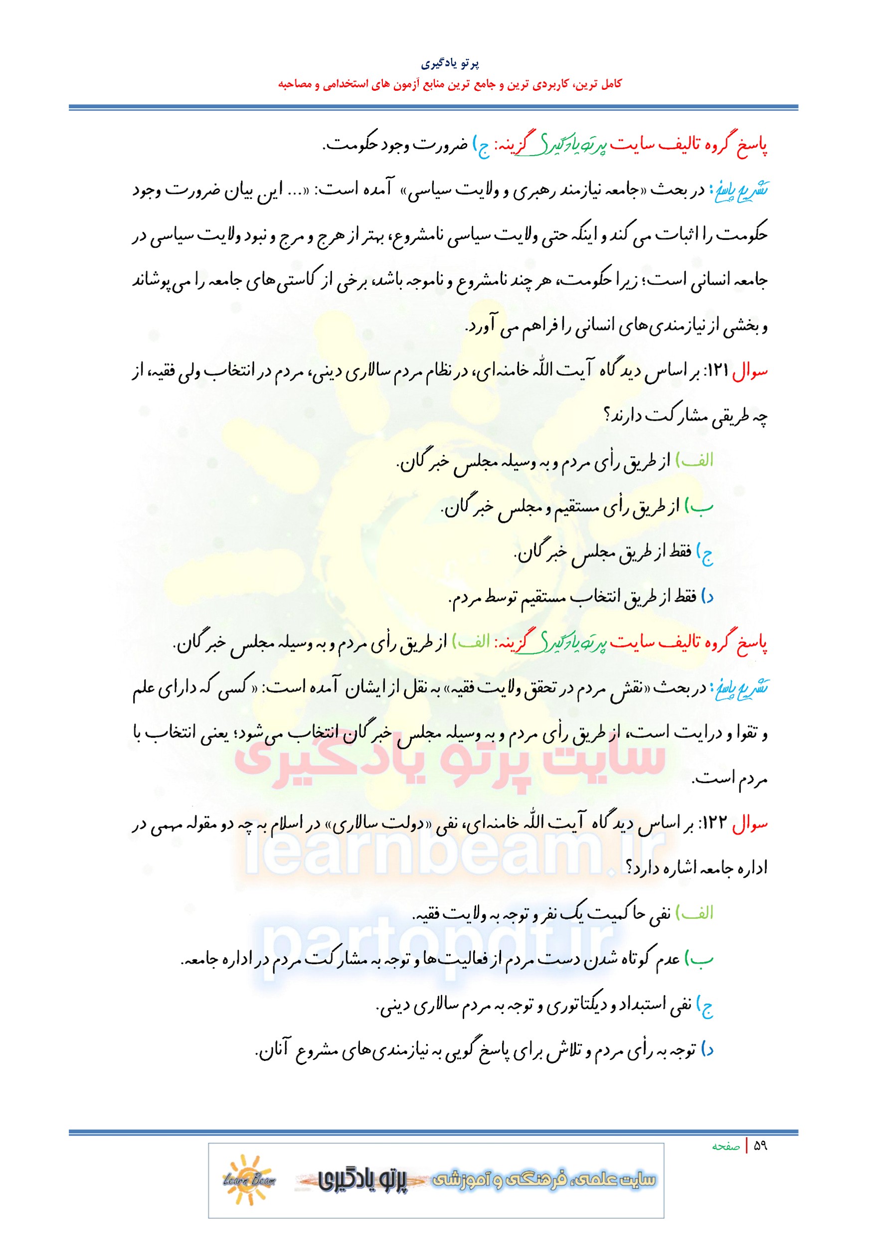 مجموعه سوالات تستی کتاب اندیشه های سیاسی مقام معظم رهبری شامل 160 تست با پاسخ در 78 صفحه در قالب فایل pdf. بهترین منبع برای آزمون های استخدامی. سوالات چهارجوابی اندیشه های سیاسی مقام معظم رهبری مطالب خوانده شده داوطلبین آزمون استخدامی را نظم بخشیده و منسجم می سازد. این مجموعه مرور سریع داوطلب را سبب می شود و آگاهی های وی را نظم بخشیده و یک آمادگی و شبیه سازی را برای جلسه آزمون به همراه دارد. مطالعه این منبع برای همه داوطلبین آزمون های استخدامی پیشنهاد می شود.