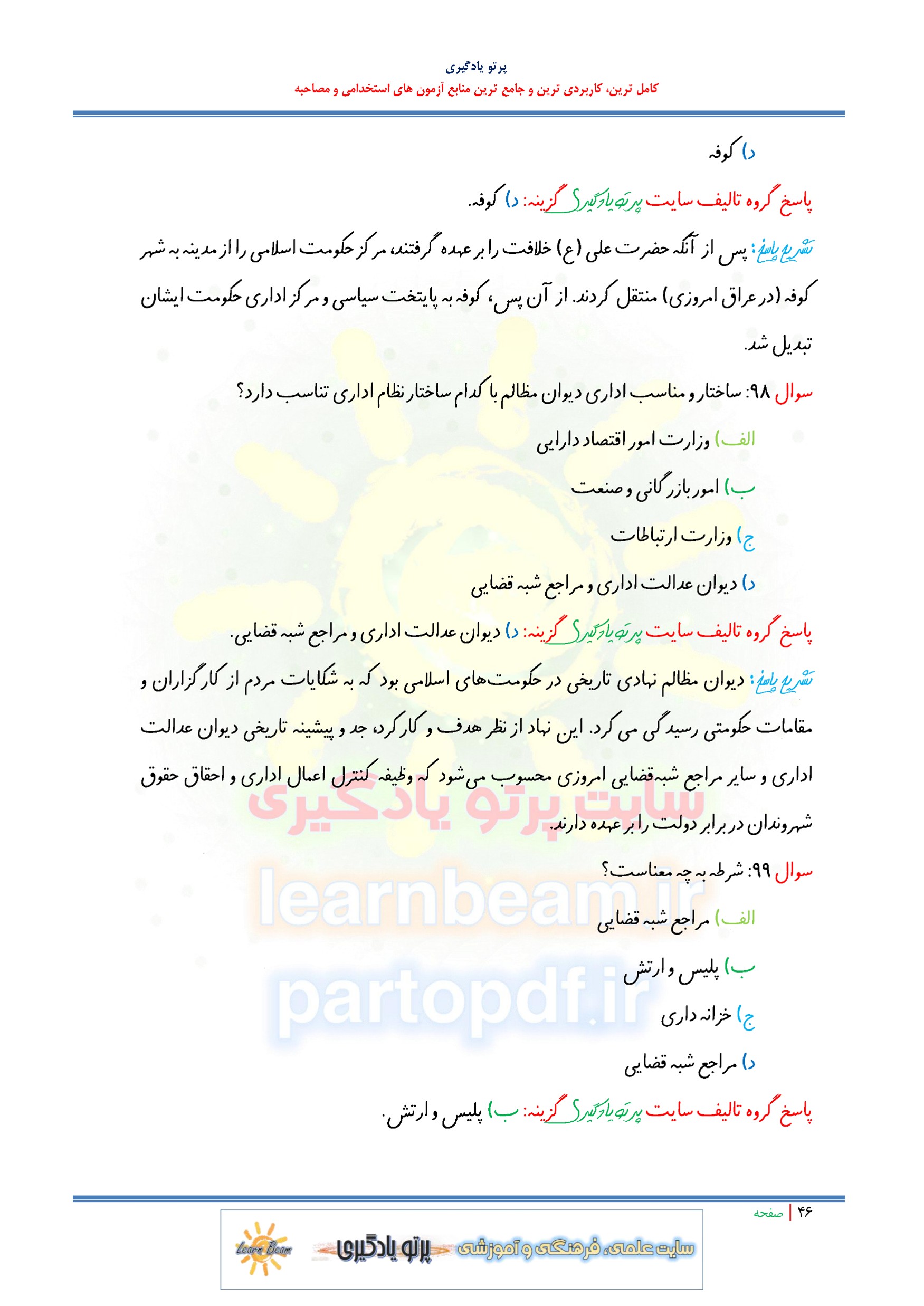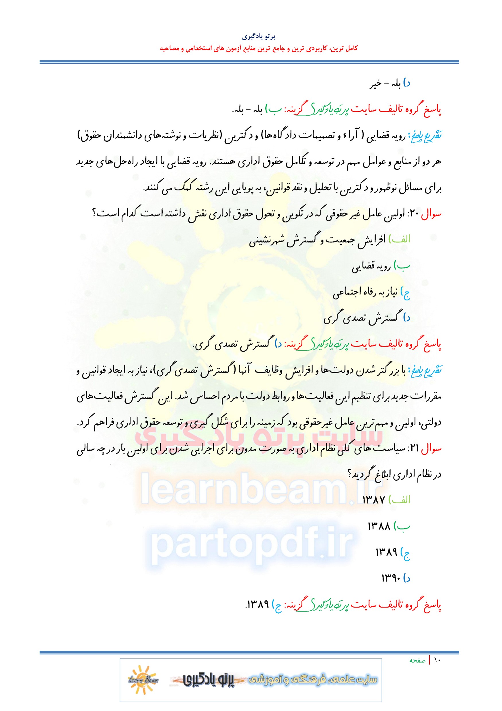 سوالات و تست حقوق اداری. سوالات تستی حقوق اداری شامل 220 سوال تستی در 104 صفحه با پاسخ تشریحی در قالب فایل pdf. مطابق با سرفصل های دفترچه آزمون های استخدامی. مجموعه سوالات تستی حقوق اداری بهترین منبع برای آمادگی آزمون های استخدامی می باشد. مجموعه سوالات و تست حقوق اداری مطالب خوانده شده داوطلبین آزمون استخدامی را نظم بخشیده و منسجم می سازد. مجموعه سوالات و تست حقوق اداری ویژه آزمون های استخدامی مرور سریع داوطلب را سبب می شود و آگاهی های وی را نظم بخشیده و یک آمادگی و شبیه سازی را برای جلسه آزمون به همراه دارد. مطالعه پک مجموعه سوالات و تست حقوق اداری برای داوطلبین آزمون های استخدامی پیشنهاد می شود.