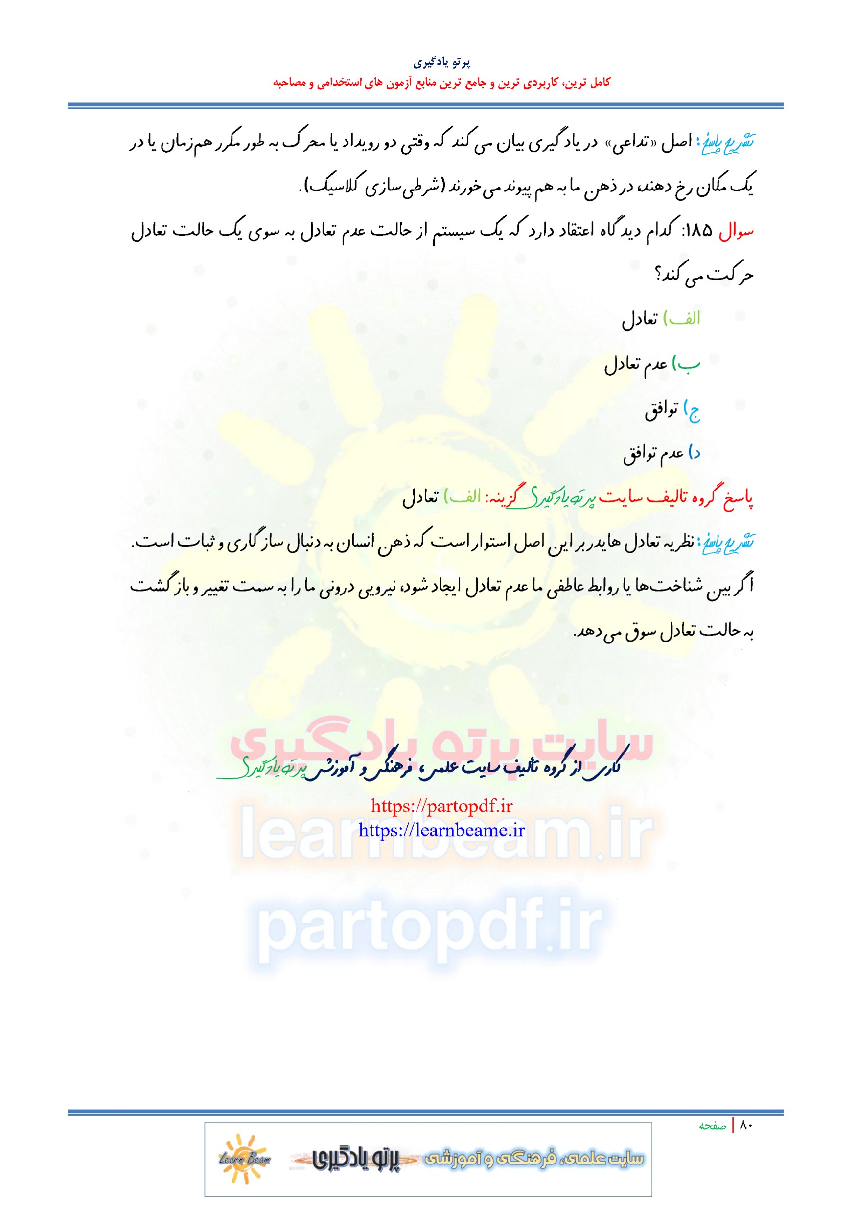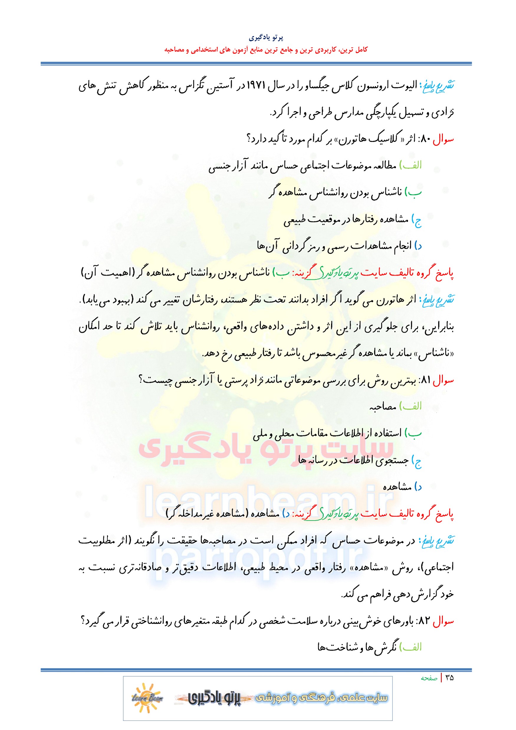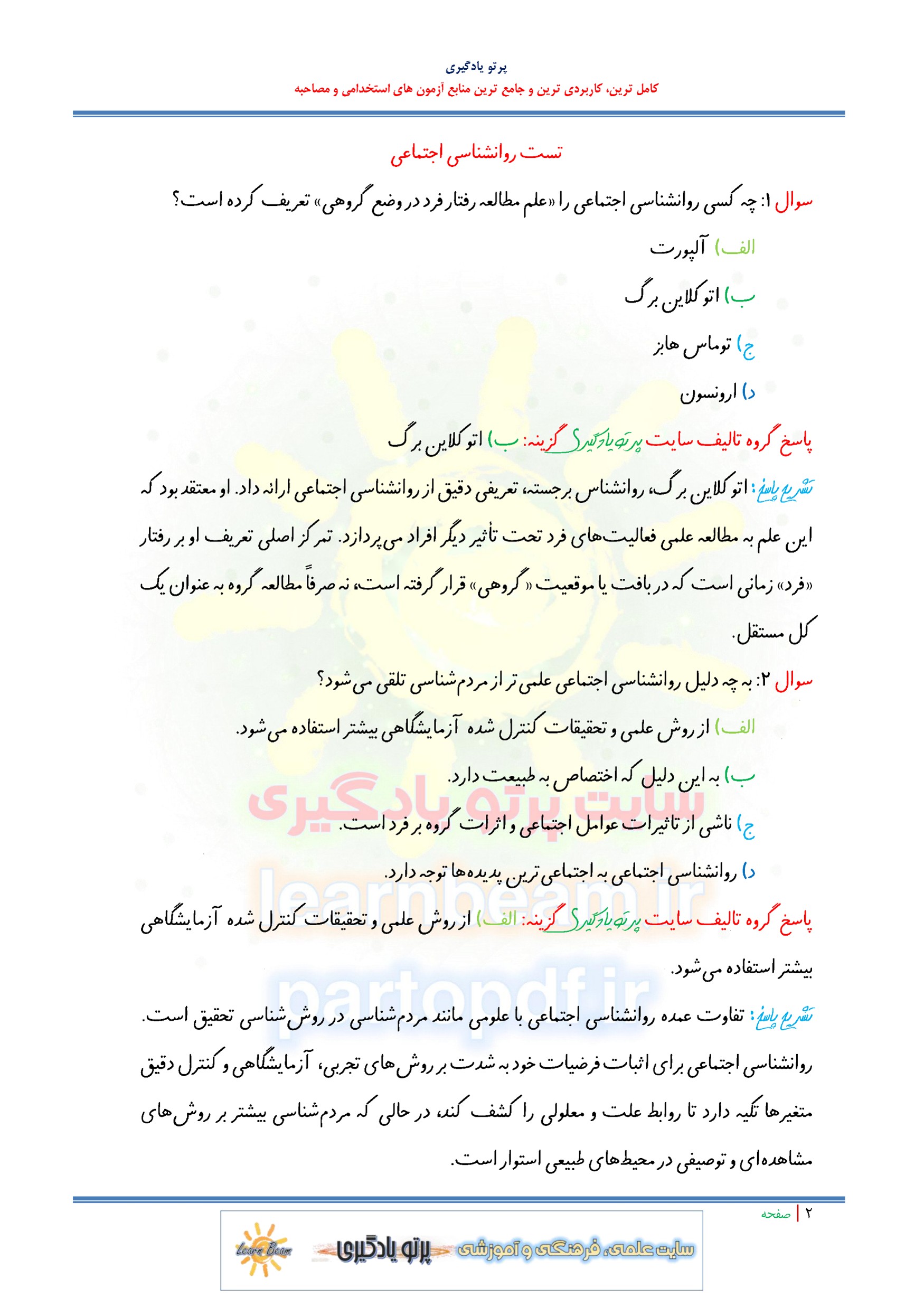 سوالات و تست کتاب روانشناسی اجتماعی مجموعه سولات تستی کتاب روانشناسی اجتماعی شامل 185سوال تستی با پاسخ تشریحی در 80 صفحه در قالب فایل pdf می باشد. مجموعه سوالات تستی کتاب روانشناسی اجتماعی قابل چاپ با کیفیت عالی جهت انسجام ذهنی، خودآزمایی و مطالعه سریع داوطلبین شرکت کننده در آزمون های استخدامی می باشد. مطابق با سرفصل های دفترچه آزمون های استخدامی. مجموعه سوالات تستی کتاب روانشناسی اجتماعی بهترین منبع برای آمادگی آزمون های استخدامی می باشد. مجموعه سوالات و تست کتاب روانشناسی اجتماعی مطالب خوانده شده داوطلبین آزمون استخدامی را نظم بخشیده و منسجم می سازد. مجموعه سوالات و تست کتابروانشناسی اجتماعی ویژه آزمون های استخدامی مرور سریع داوطلب را سبب می شود و آگاهی های وی را نظم بخشیده و یک آمادگی و شبیه سازی را برای جلسه آزمون به همراه دارد. مطالعه پک مجموعه سوالات و تست کتاب روانشناسی اجتماعی برای داوطلبین آزمون های استخدامی پیشنهاد می شود.