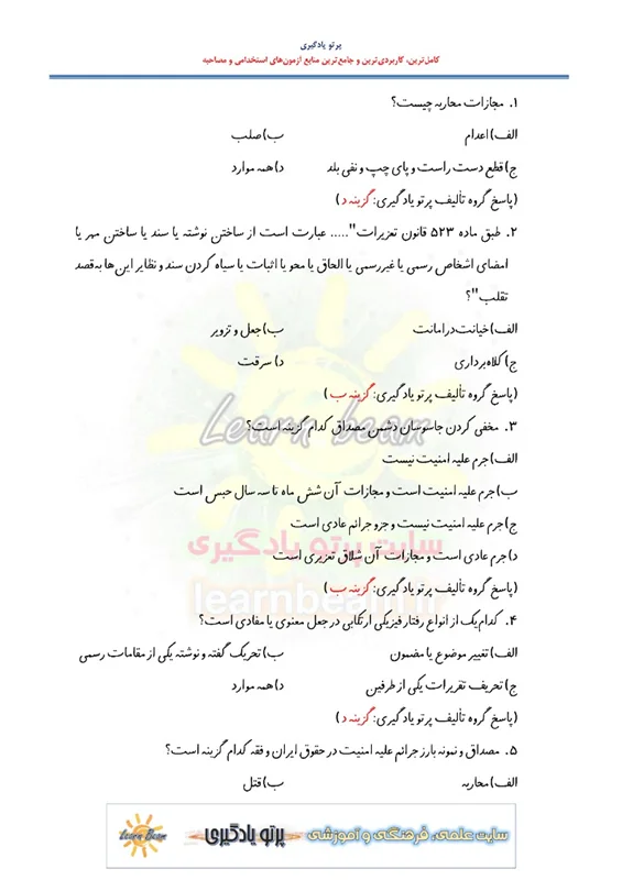 تست حقوق جزای عمومی شامل 100 تست باپاسخ در 23 صفحه در قالب فایل pdf قابل چاپ با کیفیت عالی جهت انسجام ذهنی، خودآزمایی و مطالعه سریع داوطلبین شرکت کننده در آزمون های استخدامی دستگاه های اجرایی مطابق با دفترچه راهنمای ثبت نام و مطابق با سرفصل های اعلام شده در دفترچه راهنمای ثبت نام می باشد