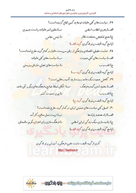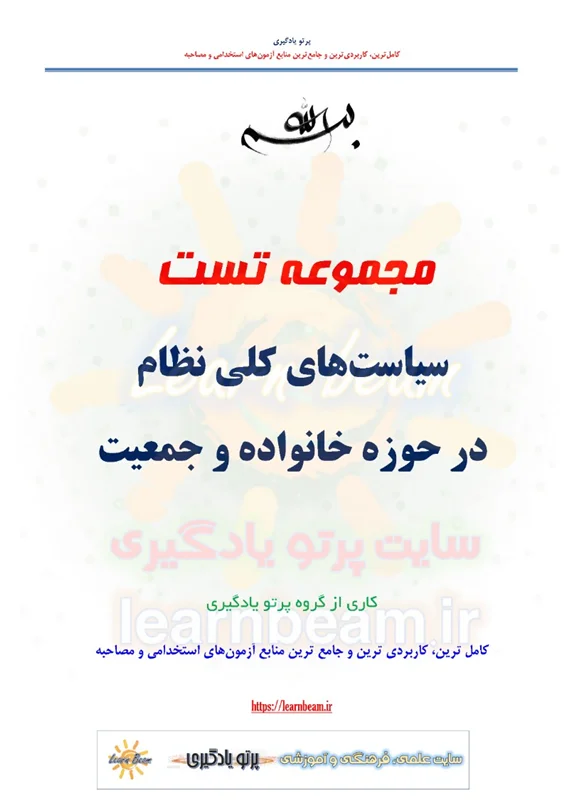 تست سیاست های کلی نظام در حوزه خانواده و جمعیت شامل 30 تست باپاسخ در 8 صفحه در قالب فایل pdf قابل چاپ با کیفیت عالی جهت انسجام ذهنی، خودآزمایی و مطالعه سریع داوطلبین شرکت کننده در دوازدهمین امتحان مشترک فراگیر دستگاه های اجرایی کشور و استخدامی دستگاه های اجرایی مطابق با دفترچه ثبت نام و مطابق با سرفصل های اعلام شده در دفترچه راهنمای ثبت نام می باشد.
